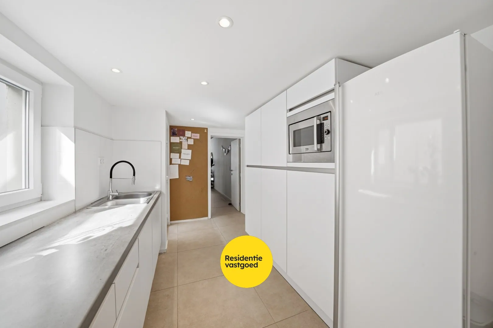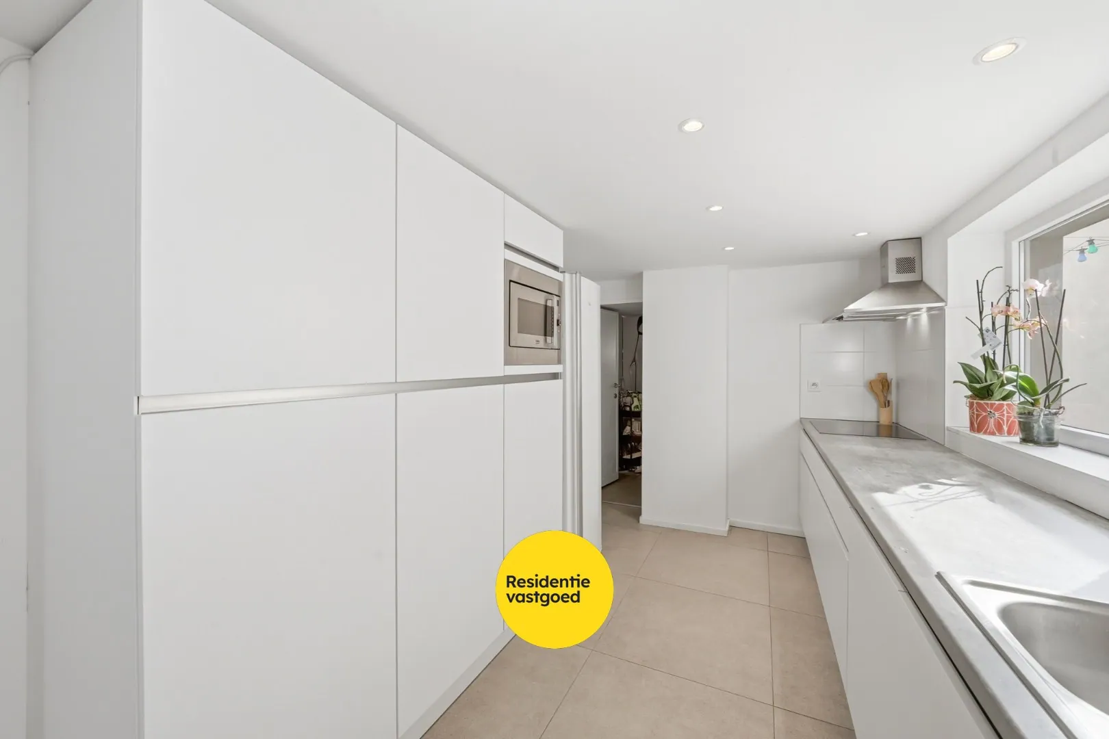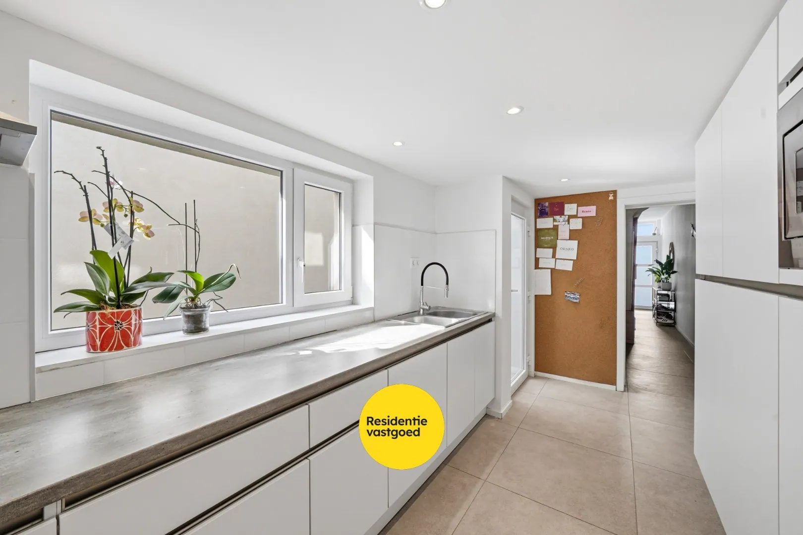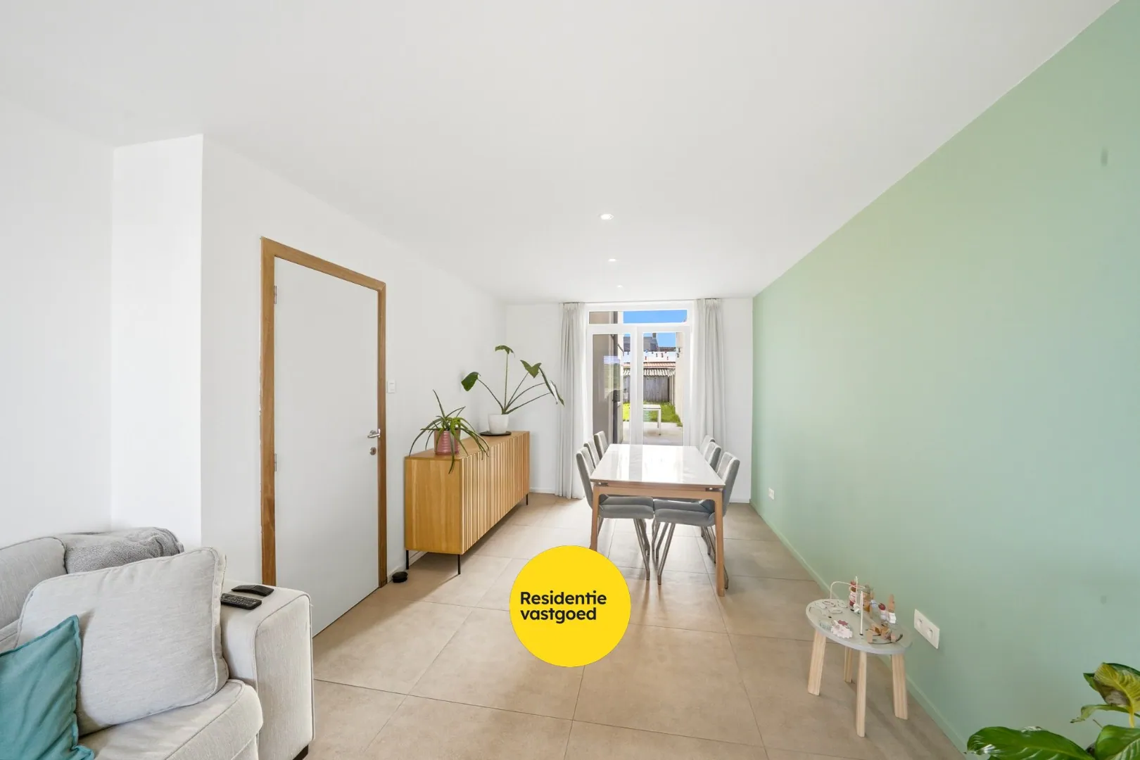 Via de inkomhal met trap naar de verdieping betreedt u de woning. De lichtrijke leefruimte is afgewerkt met tegelvloer en sluit naadloos aan op de praktische keuken.