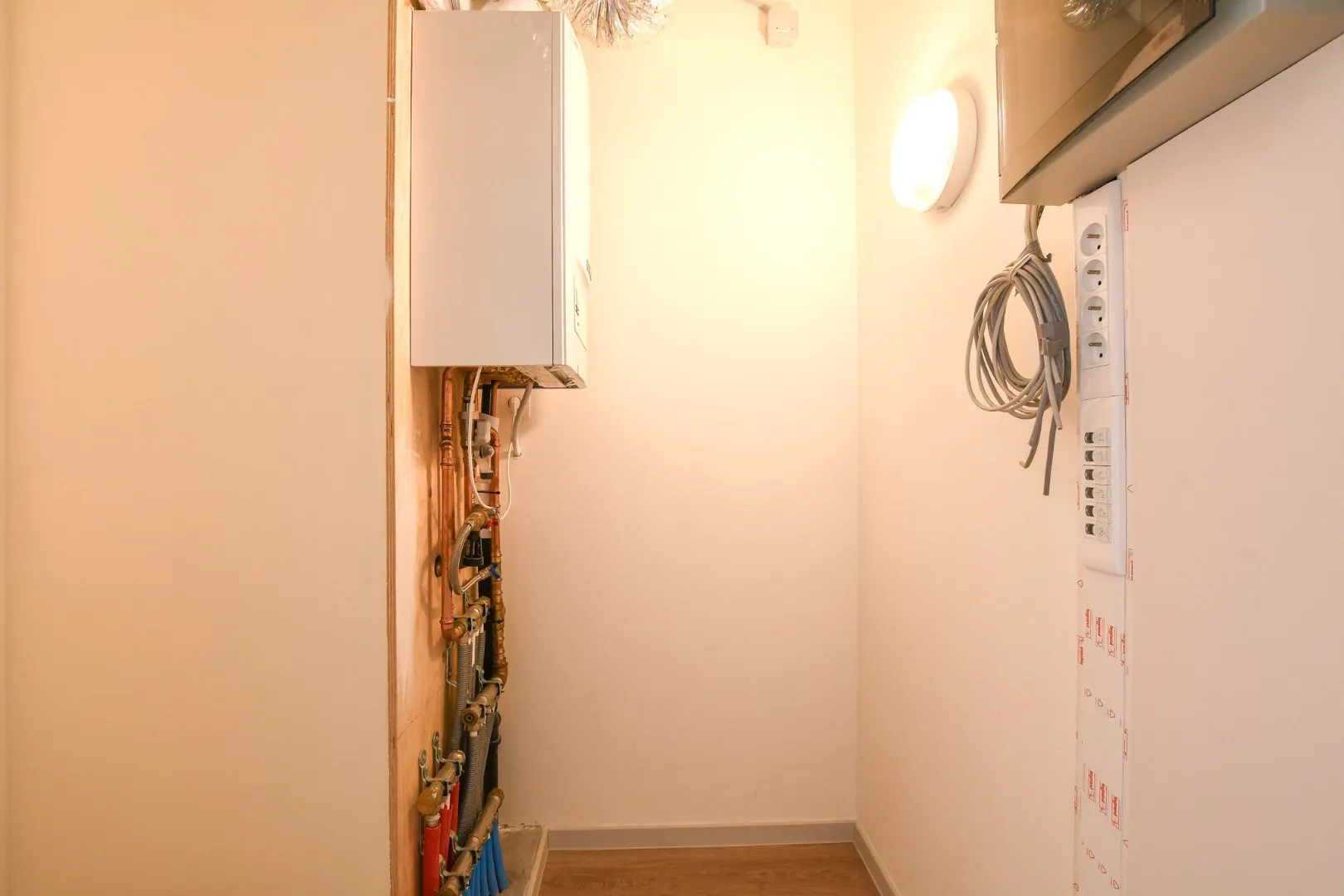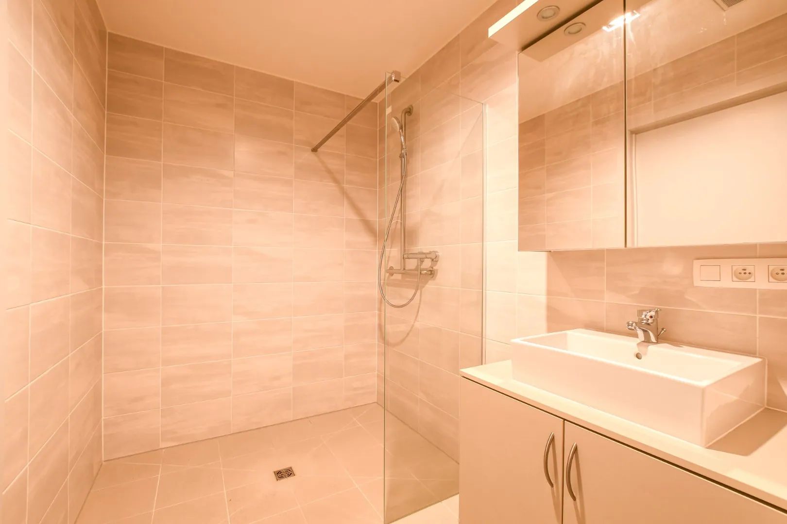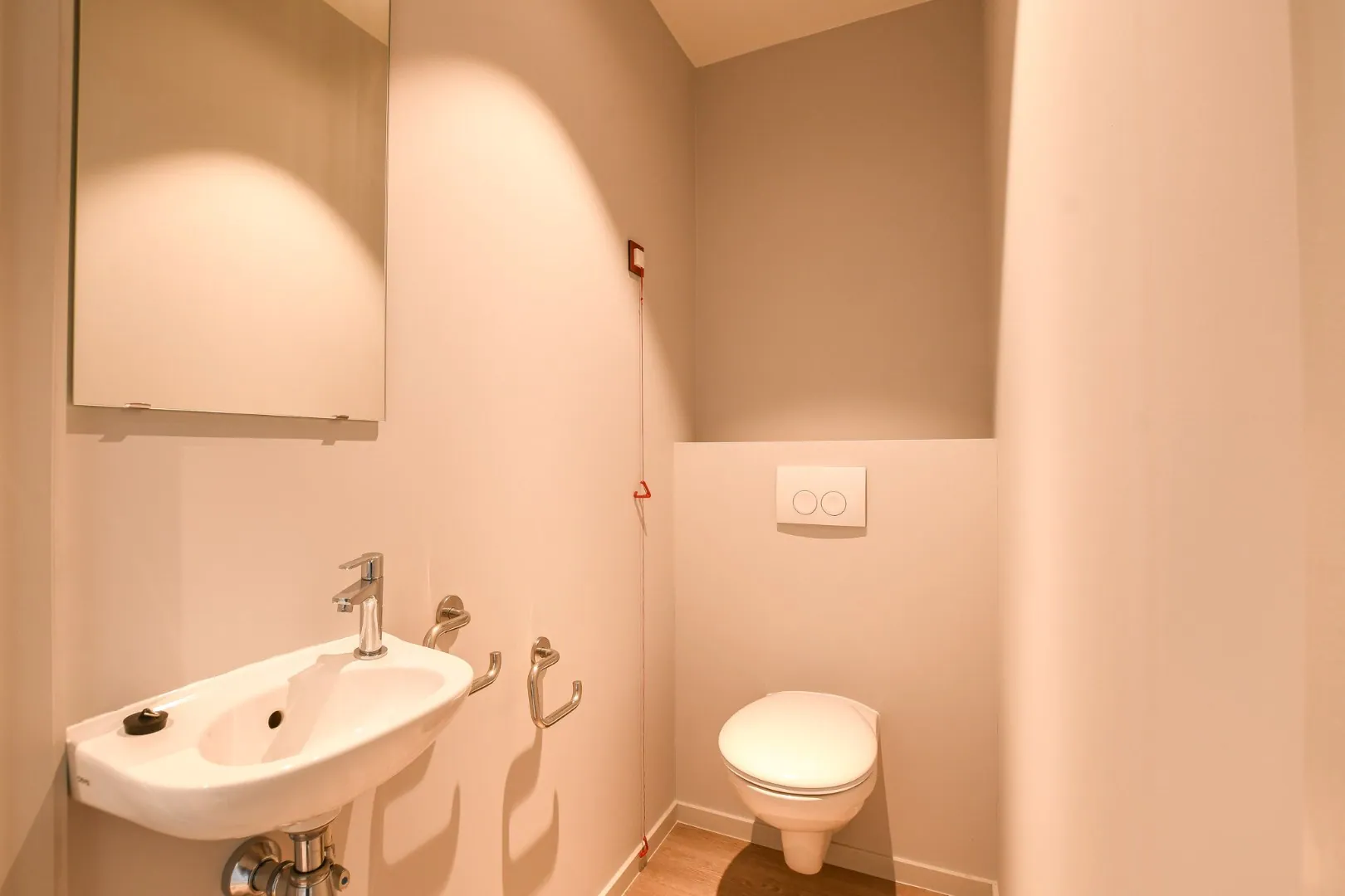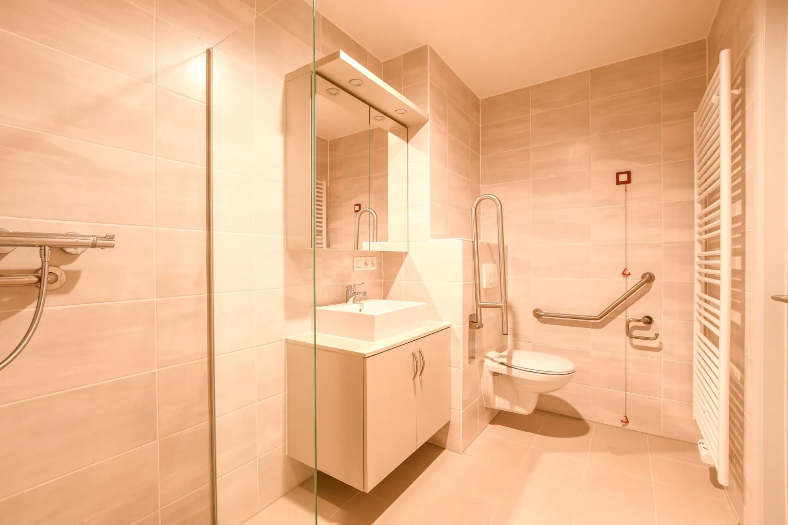 De badkamer is ingericht met een inloopdouche, een lavabomeubel, een toilet met assistentiebars en een assistentieknop. De vloer bestaat uit tegels met een antislip afwerking. Daarnaast is er ook een gastentoilet en een praktische berging met de cv-ketel, aansluiting voor de wasmachine en een ventilatiesysteem aanwezig.