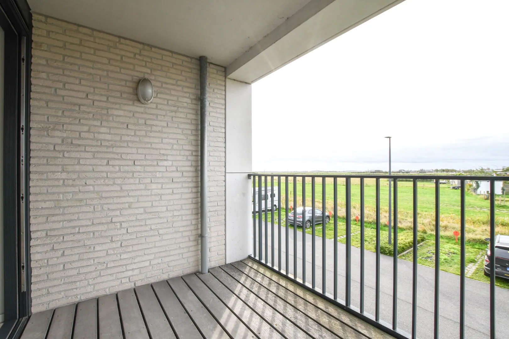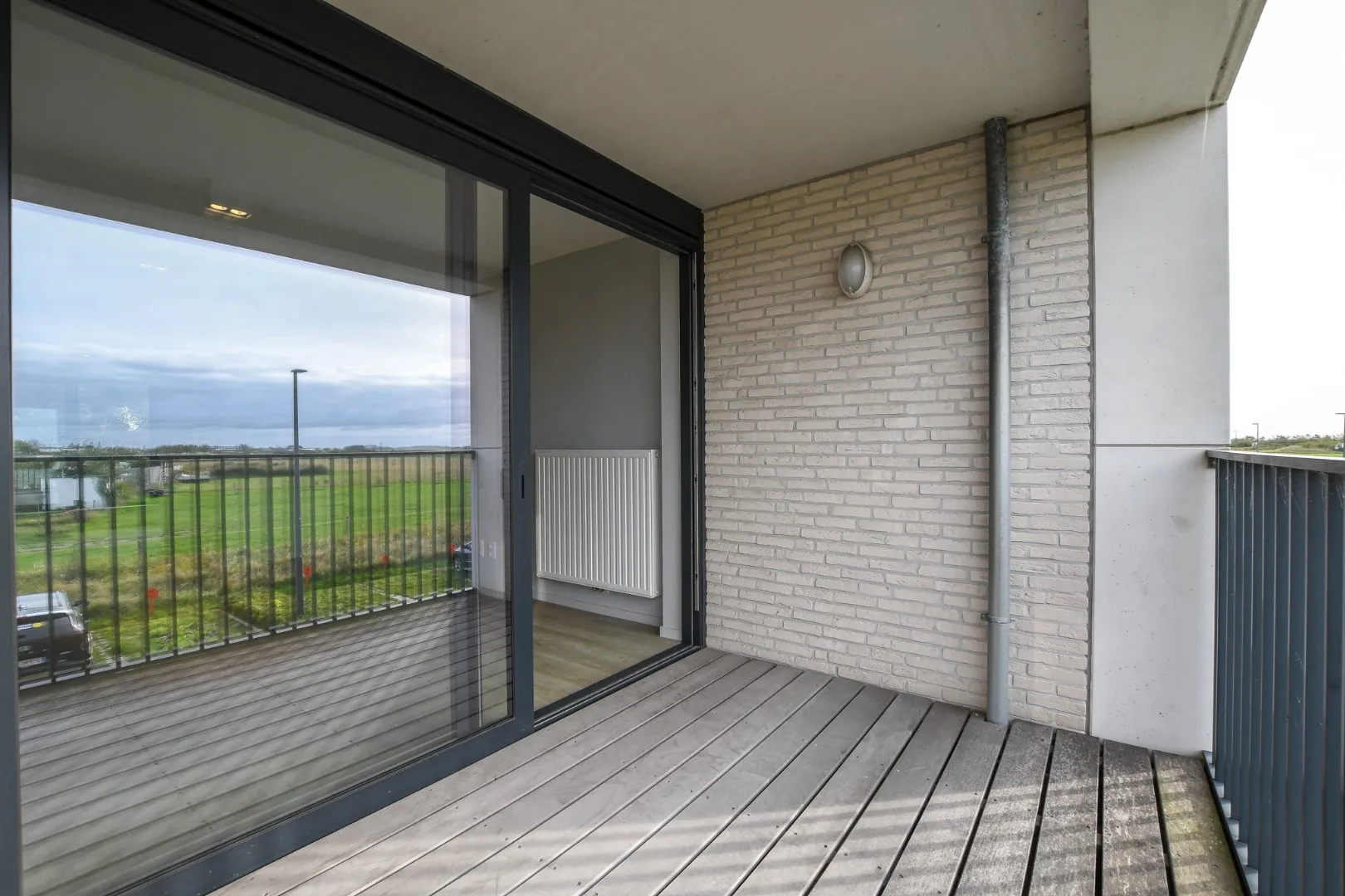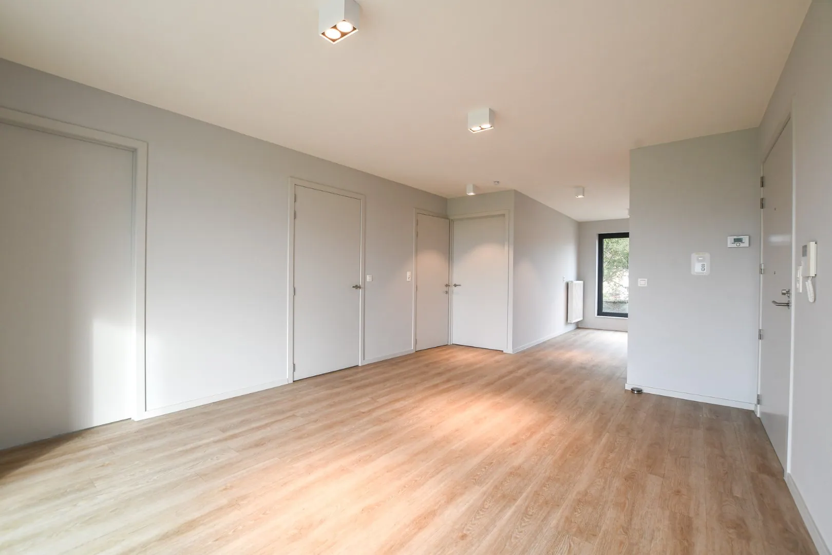 Bij binnenkomst komt u in een ruime woonkamer. De ruimte is uitgerust met een parlofoon met video en een bedieningspaneel voor assistentie. De grote schuiframen bieden toegang tot het overdekt en zuidgericht terras met zicht op de polders.