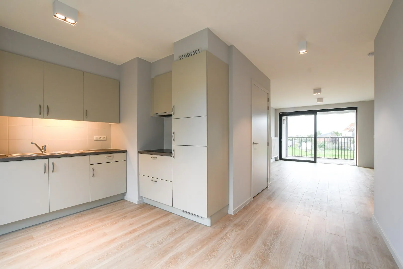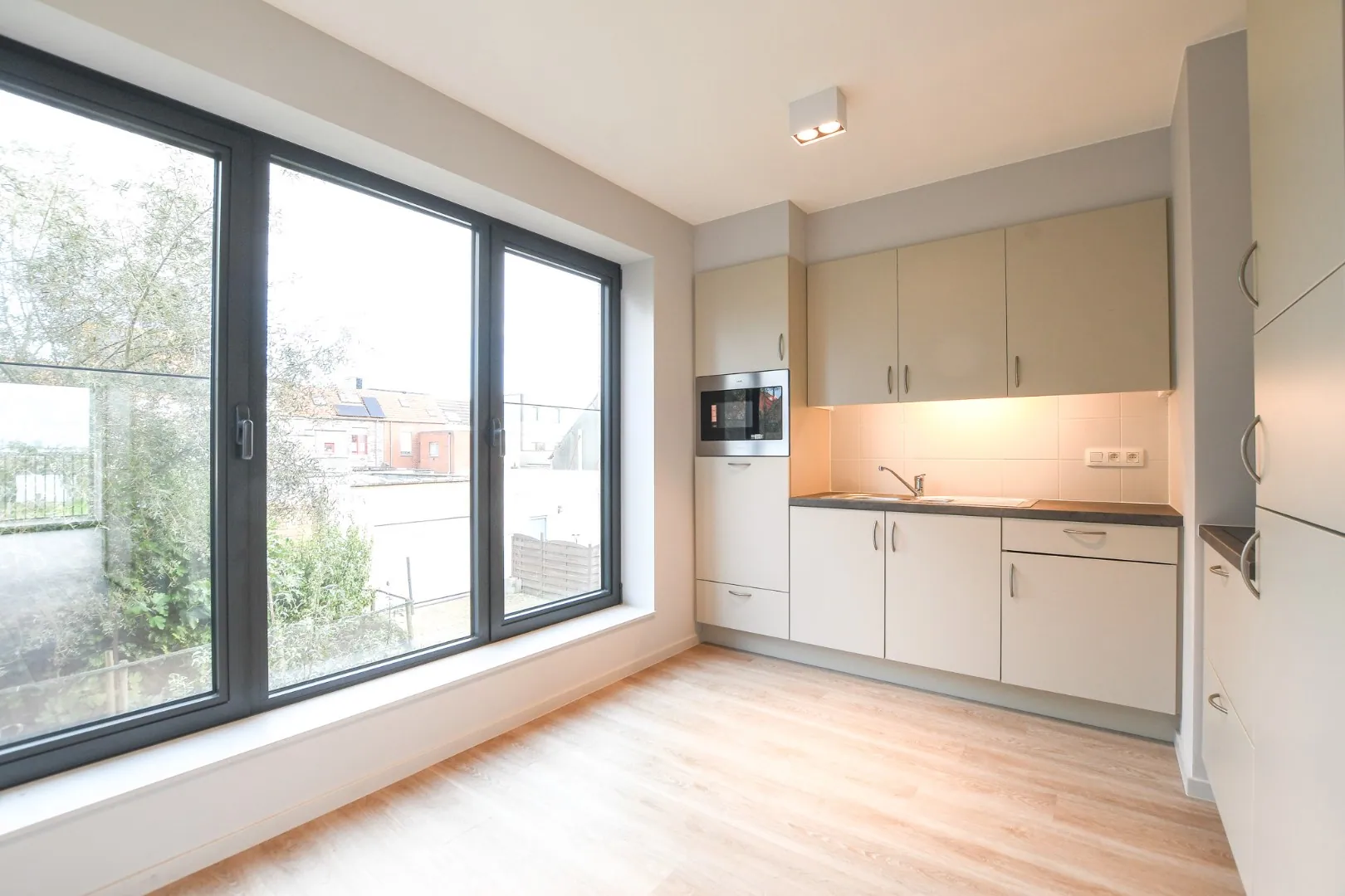 De open keuken is uitgerust met moderne apparatuur, waaronder een combi-microgolfoven, inductieplaat en een vaatwasser. De keuken is afgewerkt met een keukentablet met een stijlvolle betonlook. Hier bevinden ook ruime glaspartijen waardoor er veel lichtinval is.