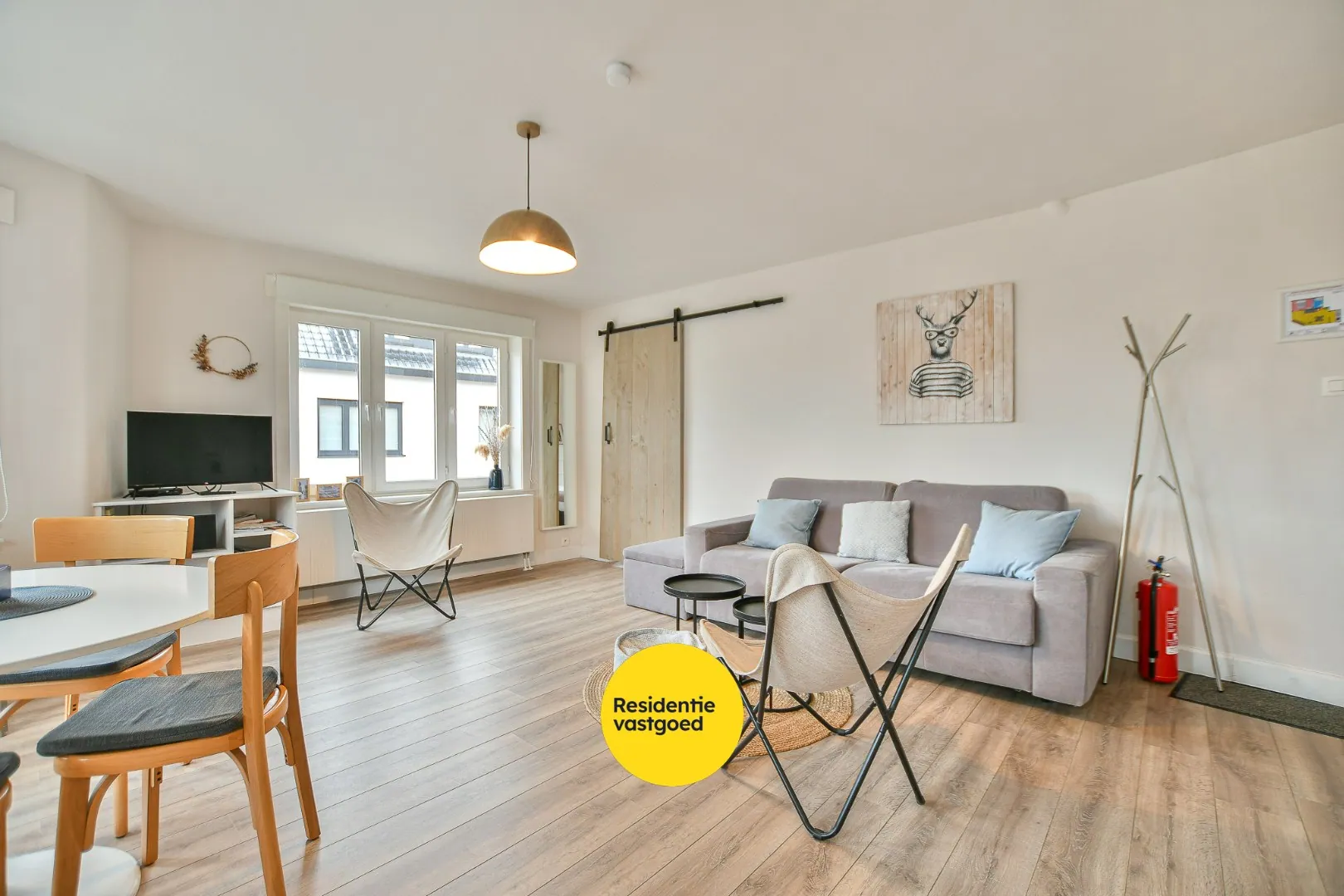 De lichtrijke woonkamer is verrassend ruim en geniet van maar liefst acht ramen, wat zorgt voor een aangename lichtinval. Ingebouwde kasten, parlofoon en aansluitingen voor internet en distributie verhogen het comfort. De compacte maar praktisch ingerichte keuken is uitgerust met alle nodige toestellen en sluit mooi aan op de leefruimte.