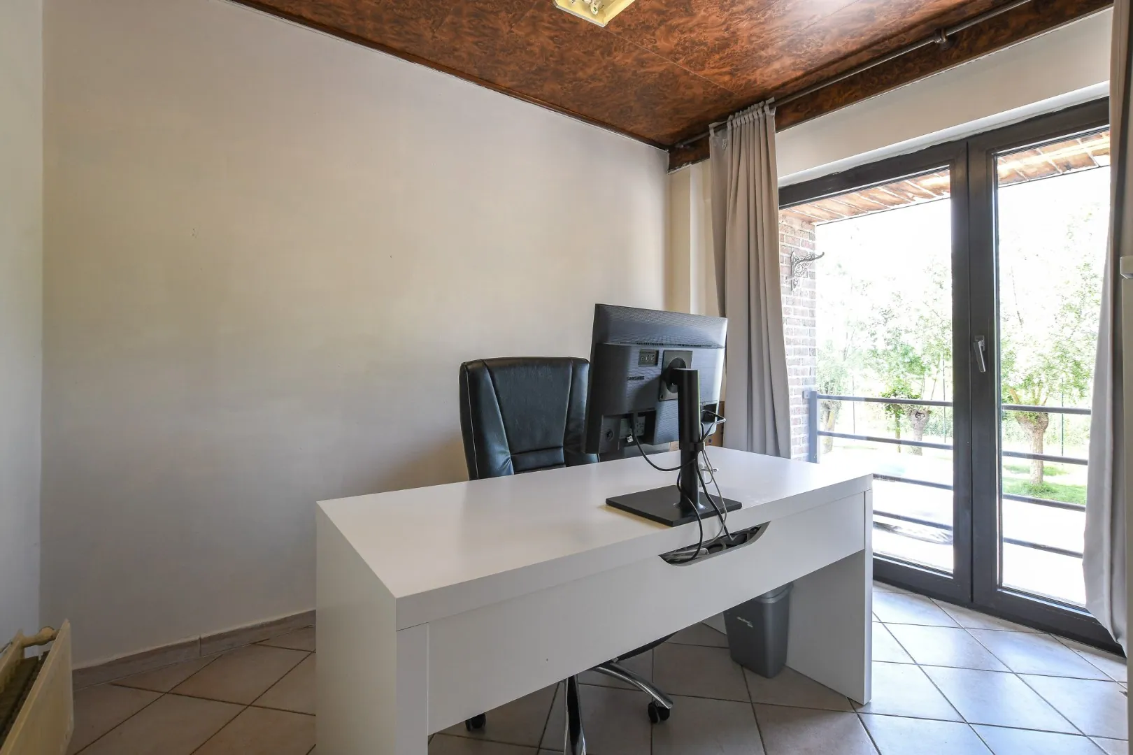 Op de eerste verdieping vindt u een lichtrijke woonkamer (met voor- en achterterras), bureau, apart toilet en volledig uitgeruste keuken.