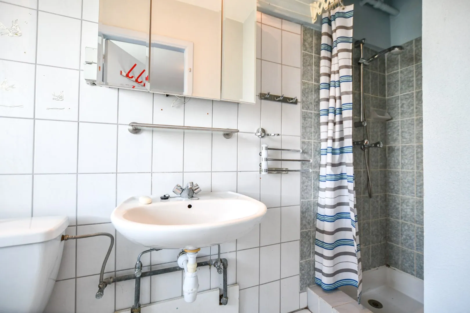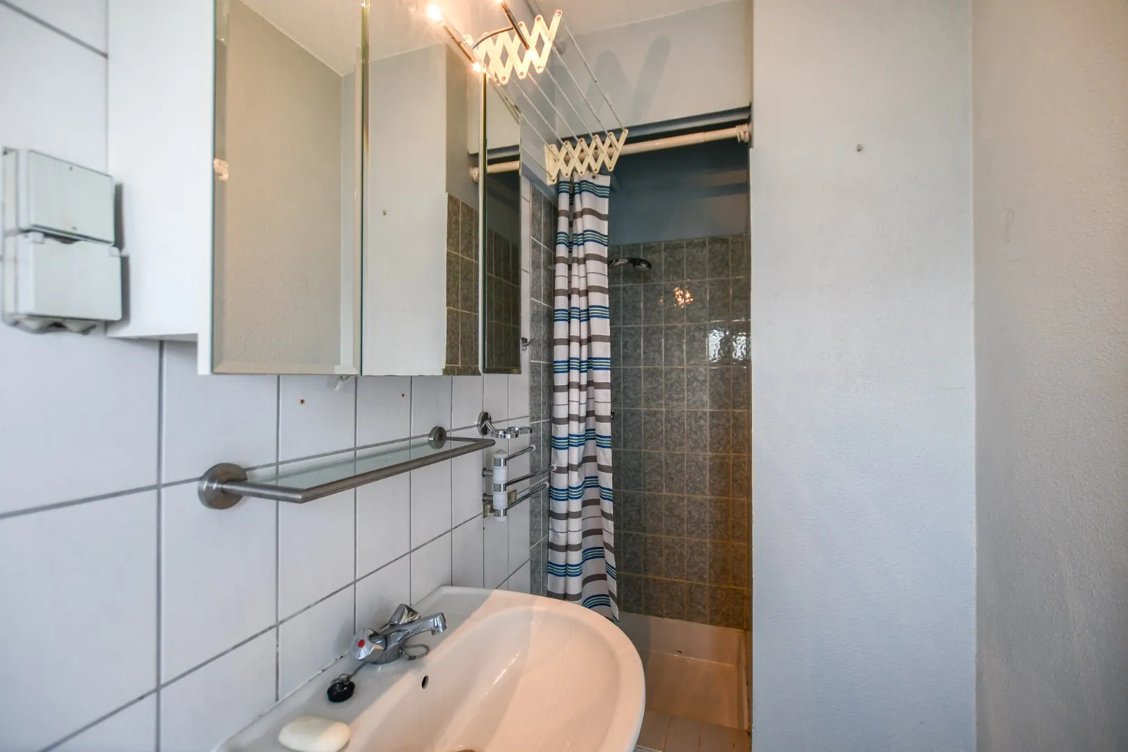 De slaapkamer is ruim genoeg voor een dubbel bed en beschikt over ingebouwde kasten, wat het opbergen makkelijk maakt. De badkamer is compact maar functioneel, met instapdouche, lavabo, toilet en een kantelraam voor natuurlijke verluchting. Overal werd gekozen voor onderhoudsvriendelijke tegelvloeren en directe elektrische verwarming, wat het appartement eenvoudig in gebruik maakt. Daarnaast beschikt het appartement over een een afzonderlijke berging.