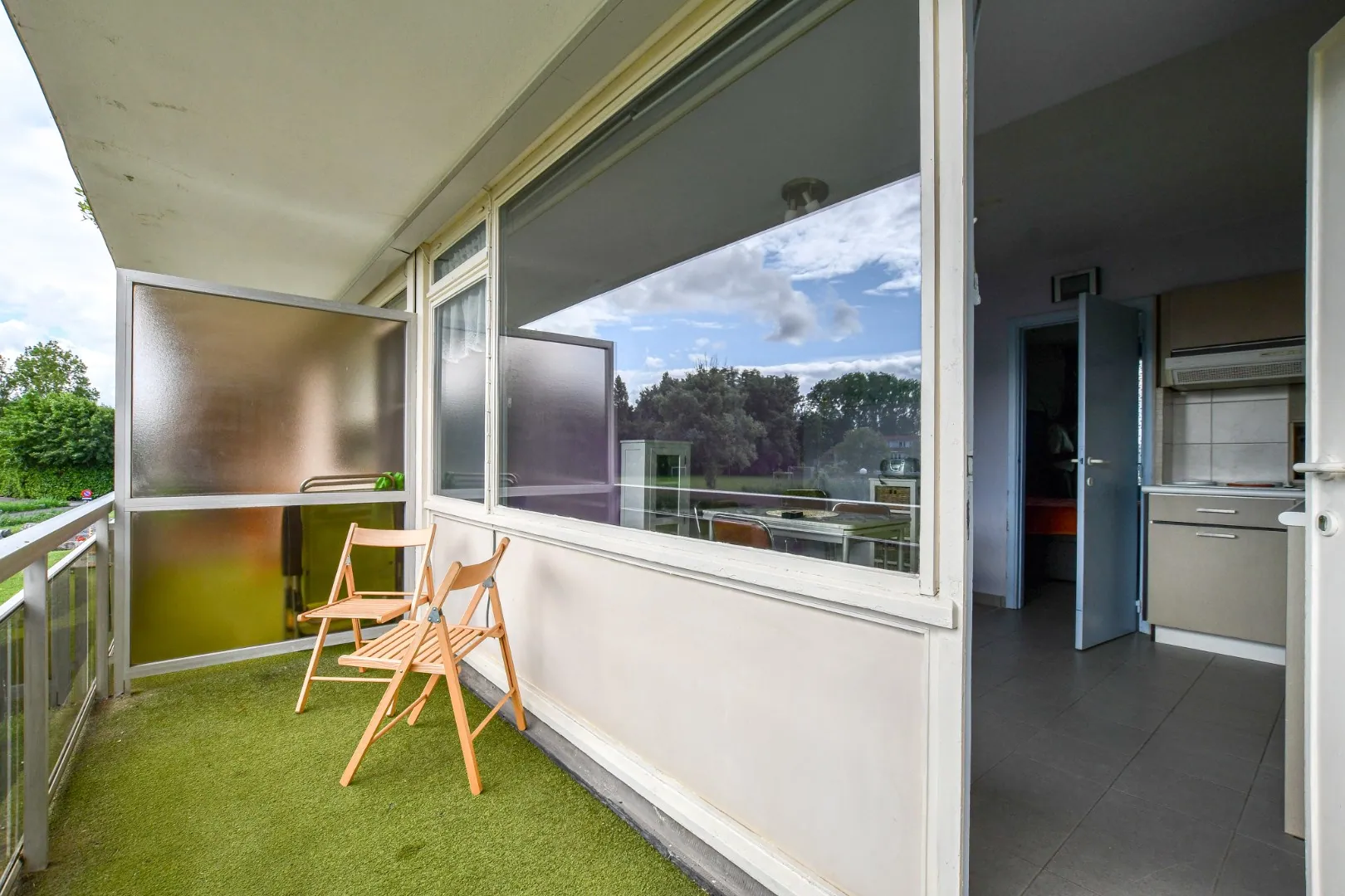 Het appartement beschikt over een lichtrijke leefruimte met open keuken, waar je dankzij de grote raampartijen en deur naar het terras geniet van veel natuurlijk licht. De keuken is praktisch ingericht en voorzien van de nodige toestellen, waaronder een koelkast, kookplaat, oven en dampkap. Aansluitend vind je het gezellige terras met kunstgras en balustrade, een fijne plek om buiten te genieten.