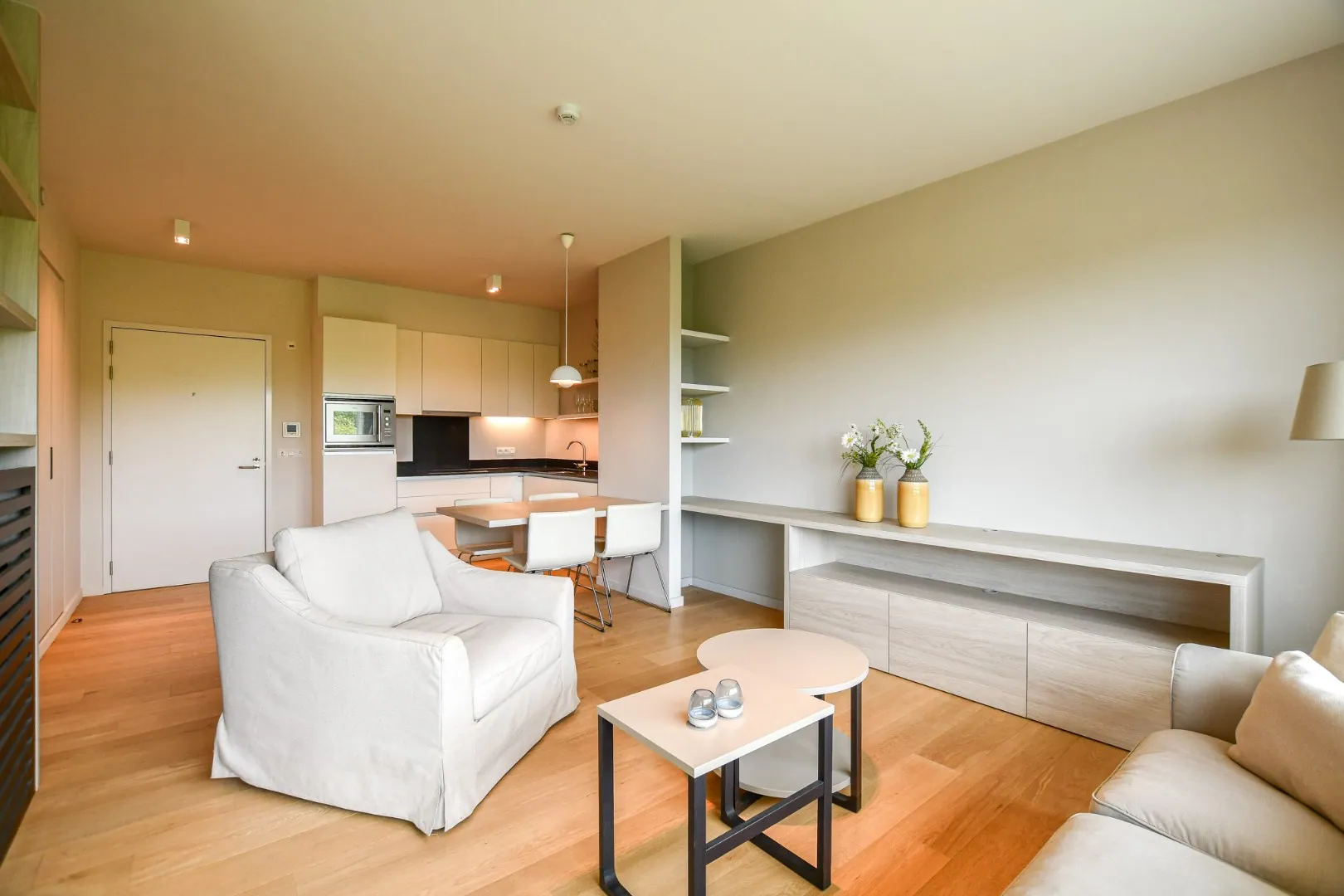 Bij het binnenkomen wordt u verwelkomd in een verzorgde inkomhal met laminaatvloer, ingebouwde kasten, een palofoon, thermostaat, brandalarm en een assistentieknop. De houten voordeur is voorzien van een kijkgat en valdorpel voor extra veiligheid.