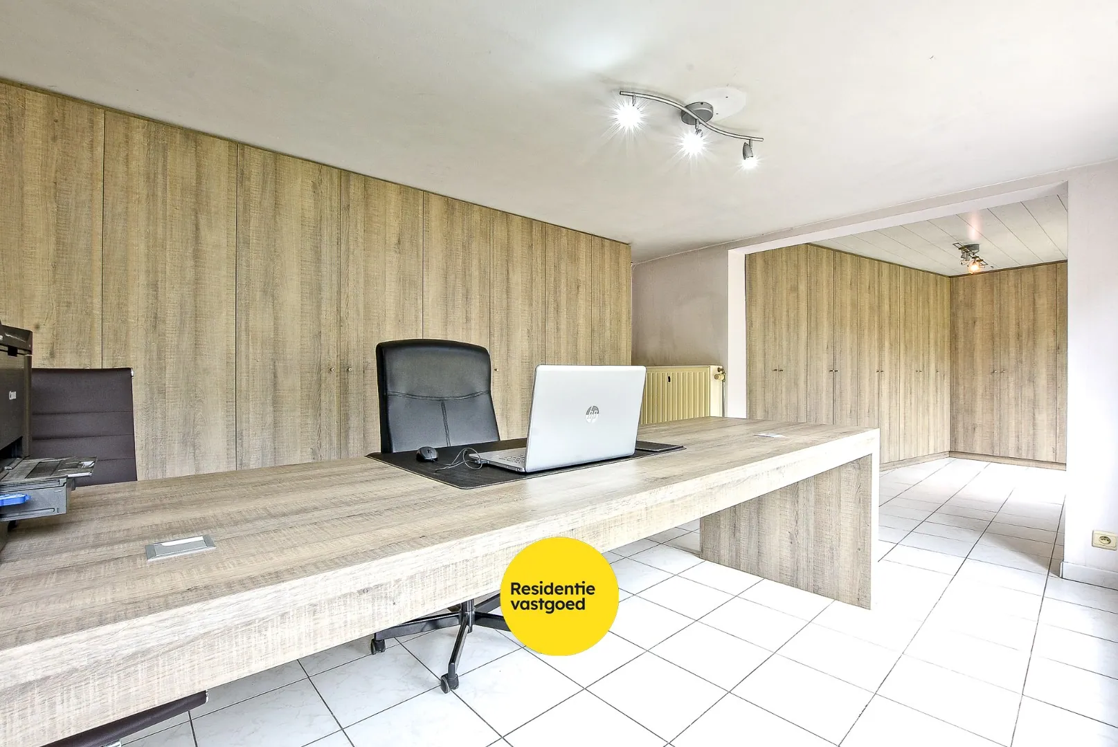 Inkom, leefruimte, open keuken, wasruimte met douche, apart toilet, bureau/slaapkamer met maatwerkkasten.
