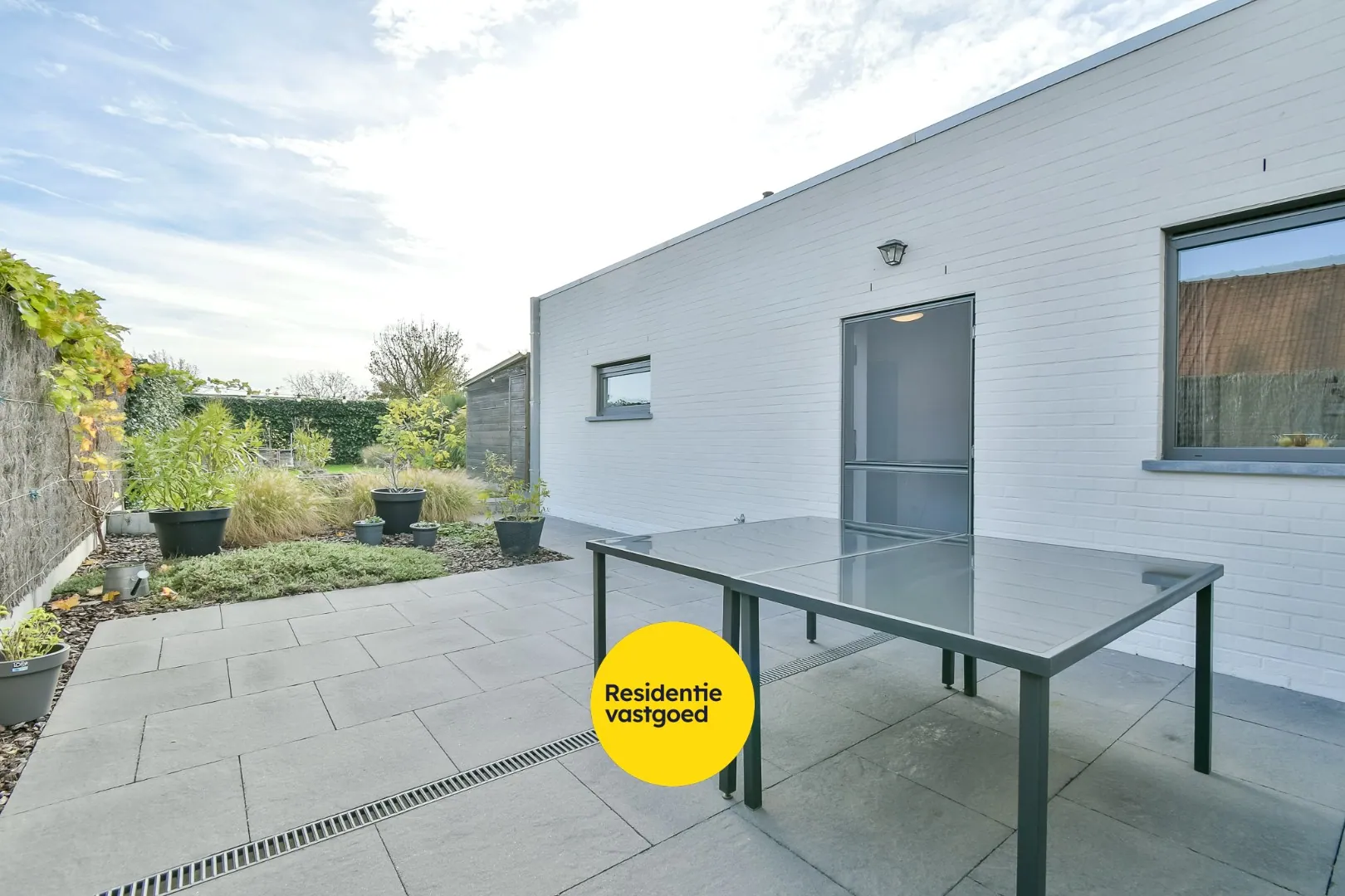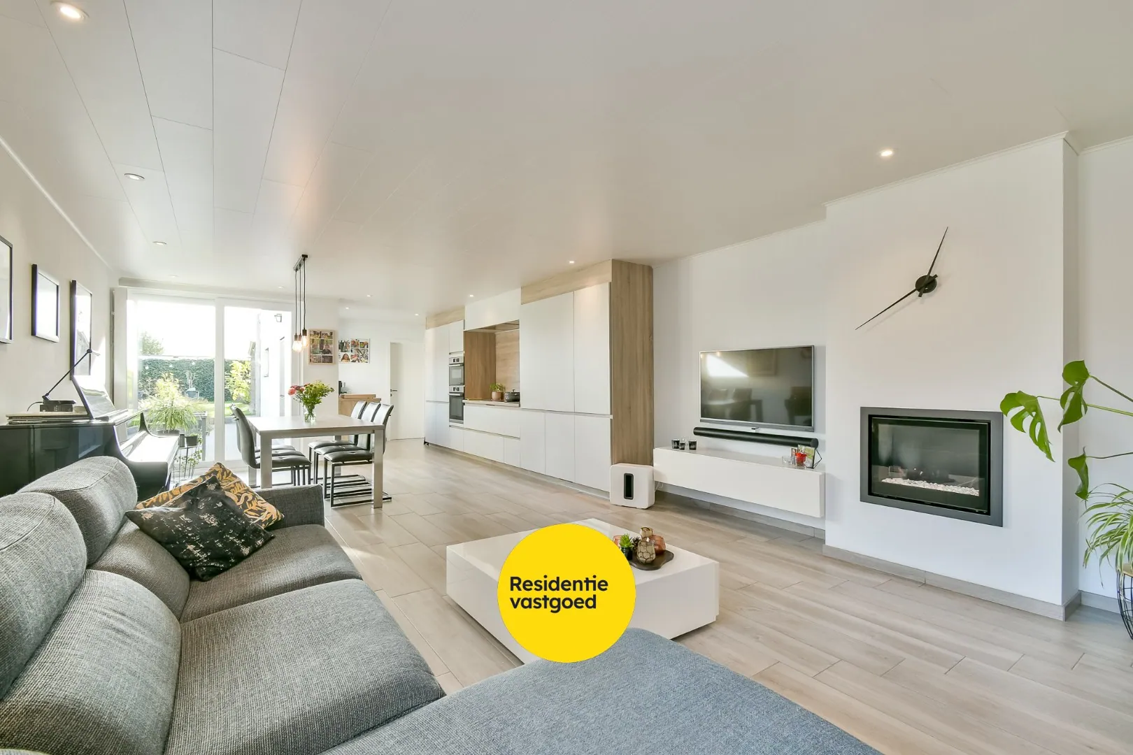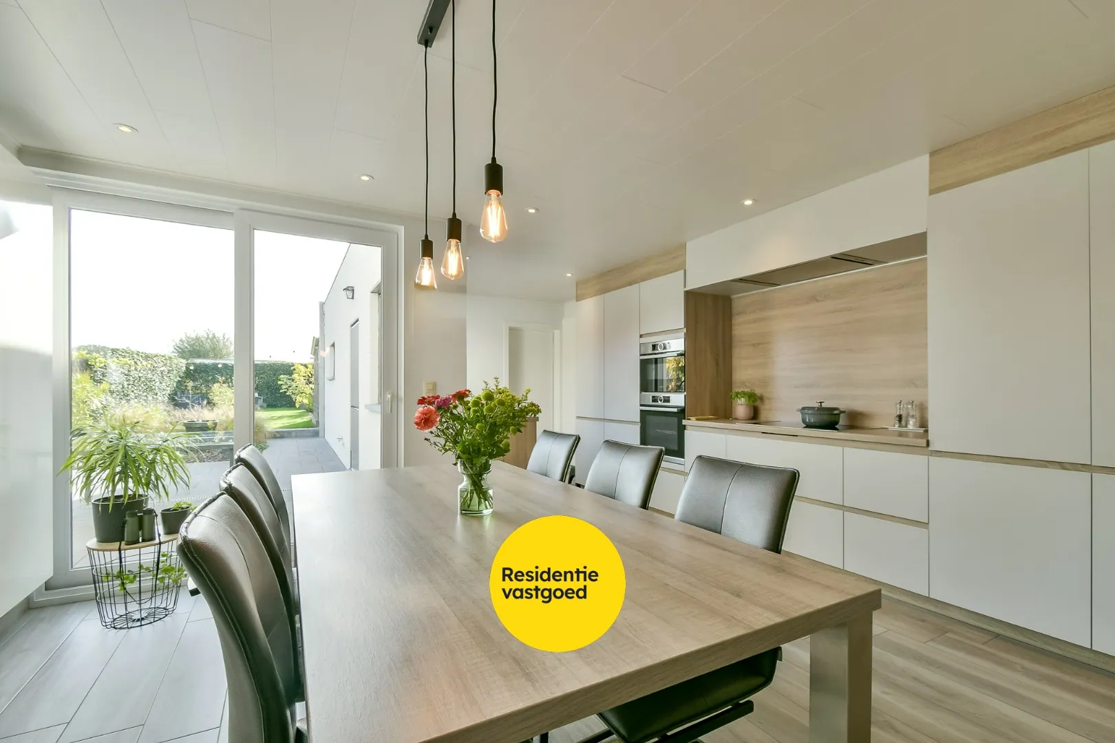 De lichte en gezellige leefruimte baadt in natuurlijk licht dankzij de grote raampartijen en sluit naadloos aan op de recente open keuken, afgewerkt met kwalitatieve materialen en moderne toestellen. Vanuit de keuken geniet je van een prachtig uitzicht op de onderhoudsvriendelijke, fraai aangelegde tuin.