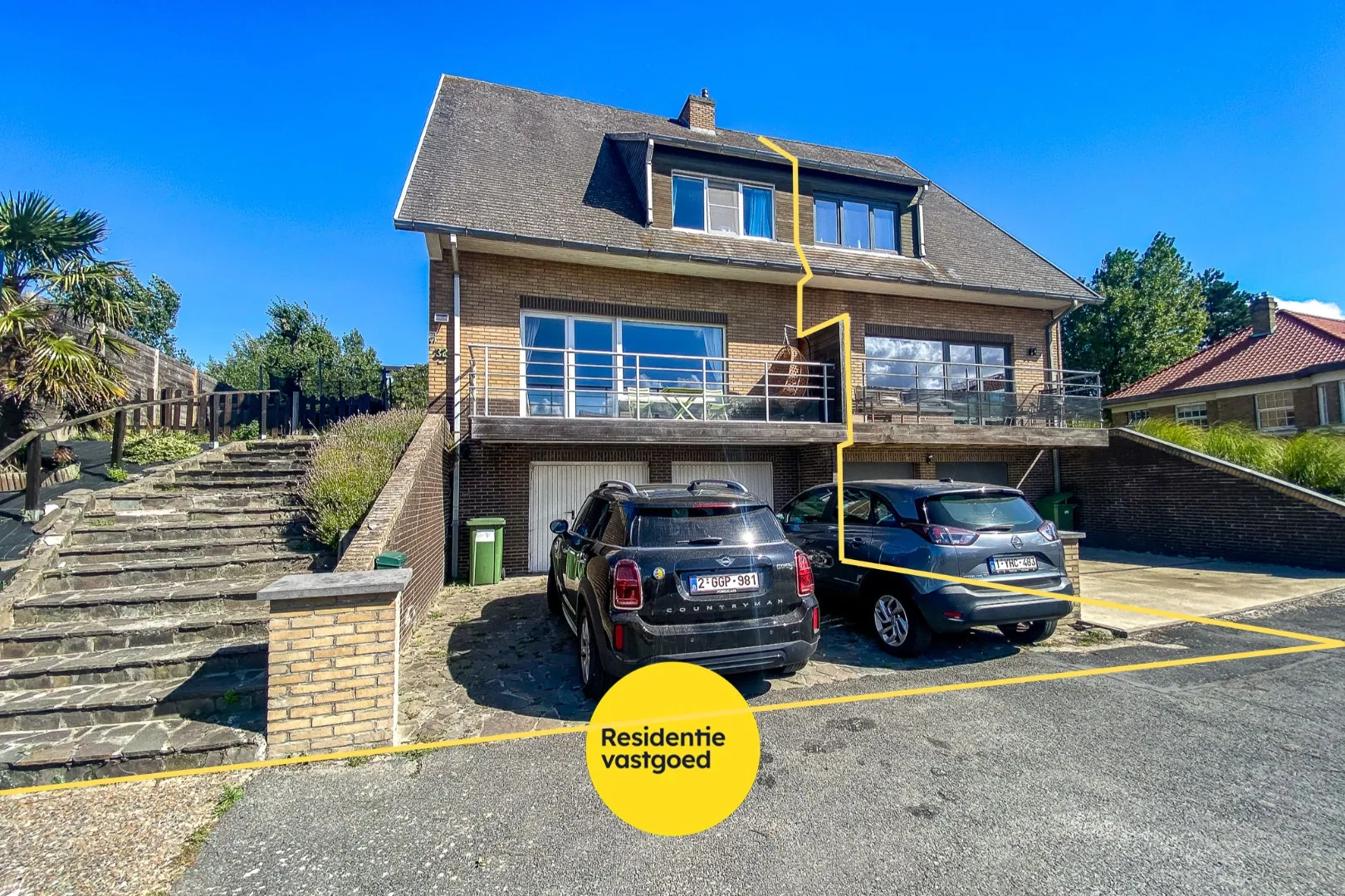 Tuin rondom de woning. Voor de inpandige dubbele garage is nog een privé-oprit met 2 parkeerplaatsen voorzien.