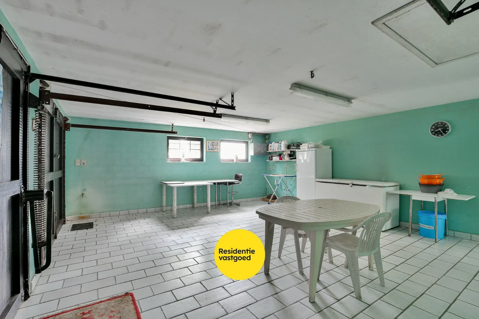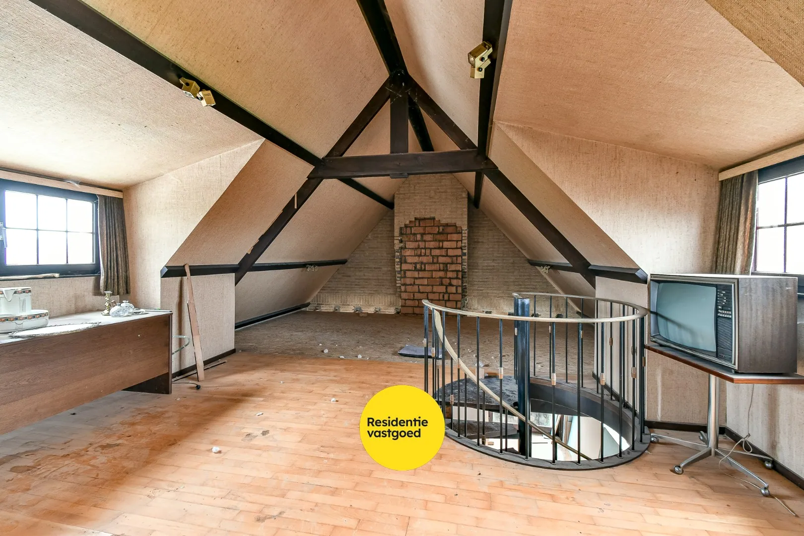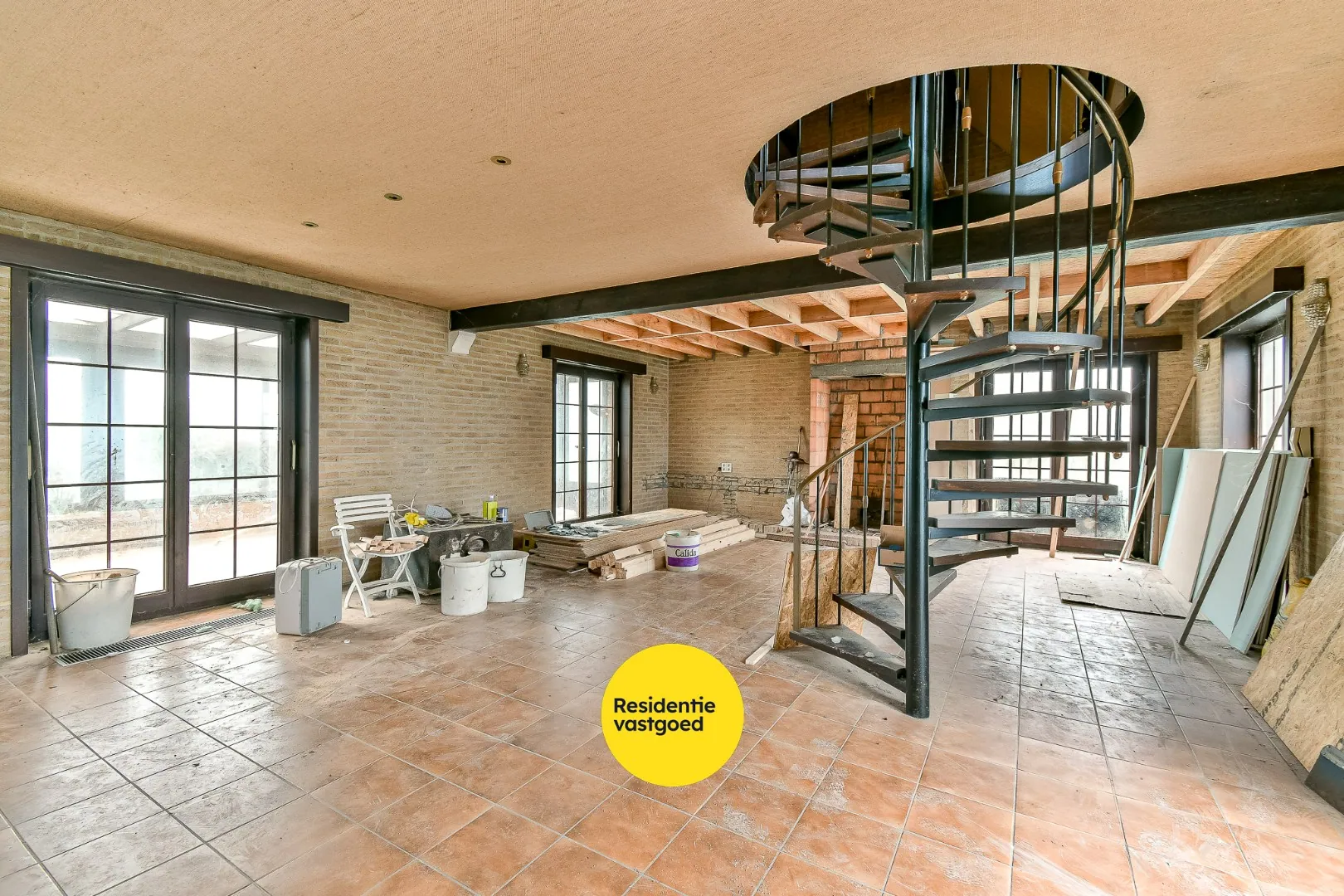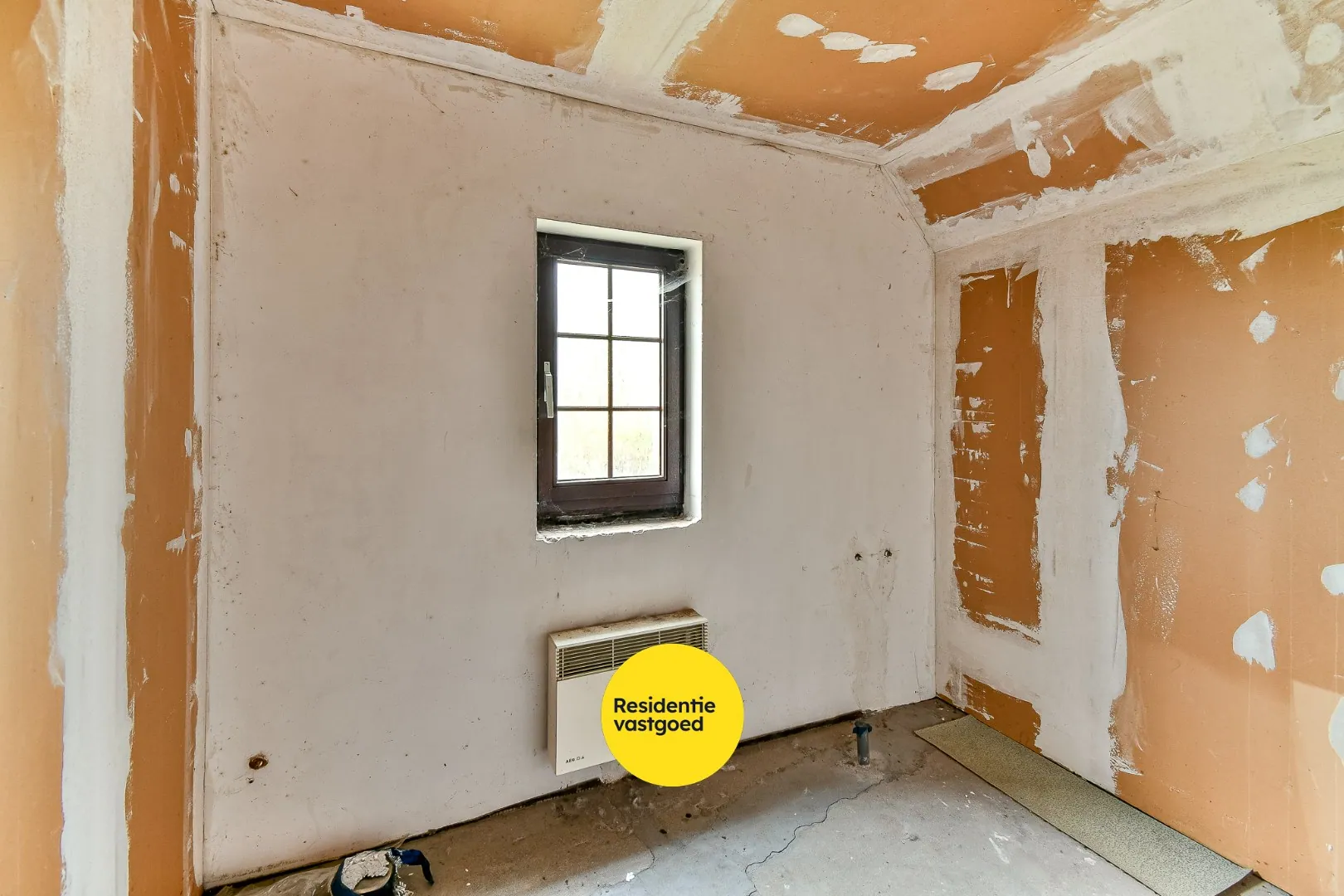 Op het gelijkvloers vindt u verder een slaapkamer, een ruime nog in te richten badkamer, een apart gastentoilet en een dubbele garage. Via de draaitrap in de leefruimte bereikt u de bovenverdieping, waar een open ruimte werd gecreëerd die kan dienen als bureau of leeshoek. Hier kan ook bovendien een tweede slaapkamer gerealiseerd worden, terwijl een derde slaapkamer voorzien is met een nog in te richten badkamer. Boven de garage bevindt zich een ruime zolderverdieping, die door het plaatsen van een vaste trap kan worden omgevormd tot een bijkomende slaapkamer. De volledige woning is onderkelderd en biedt zo veel praktische opslagruimte.