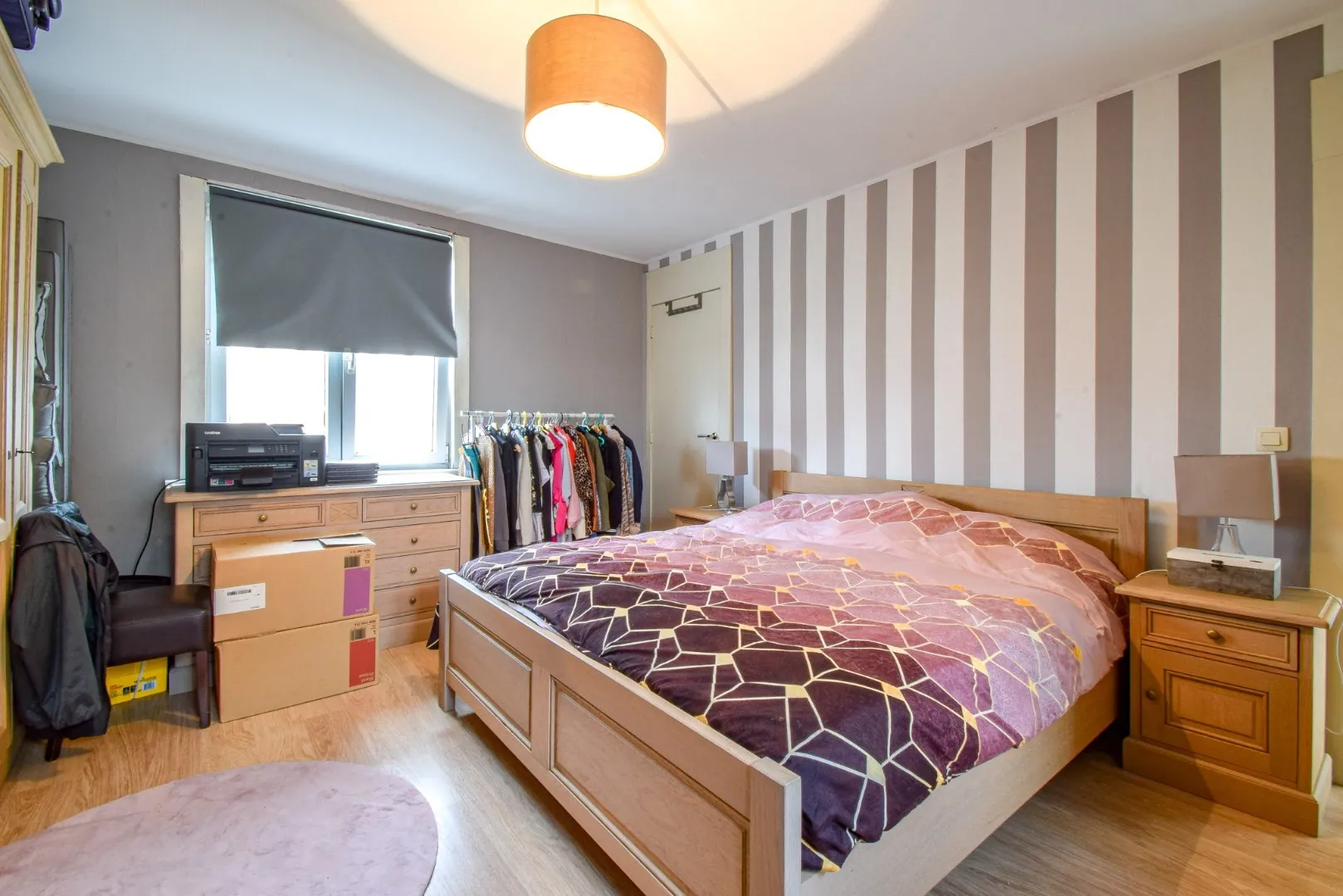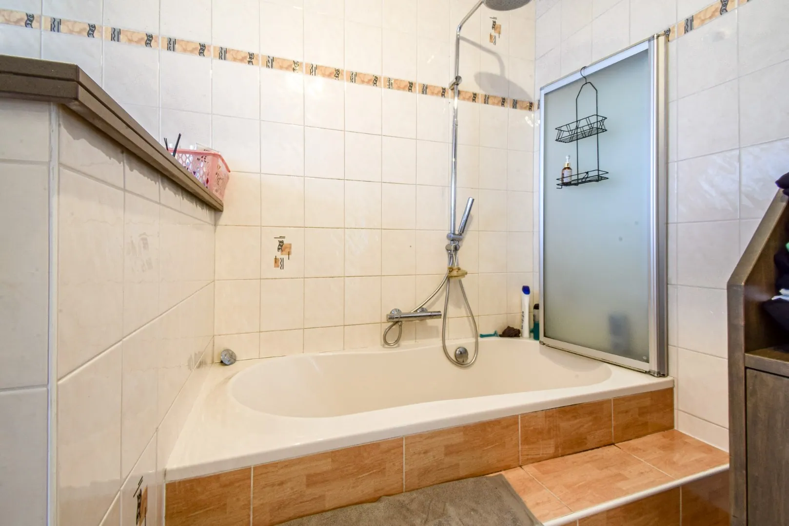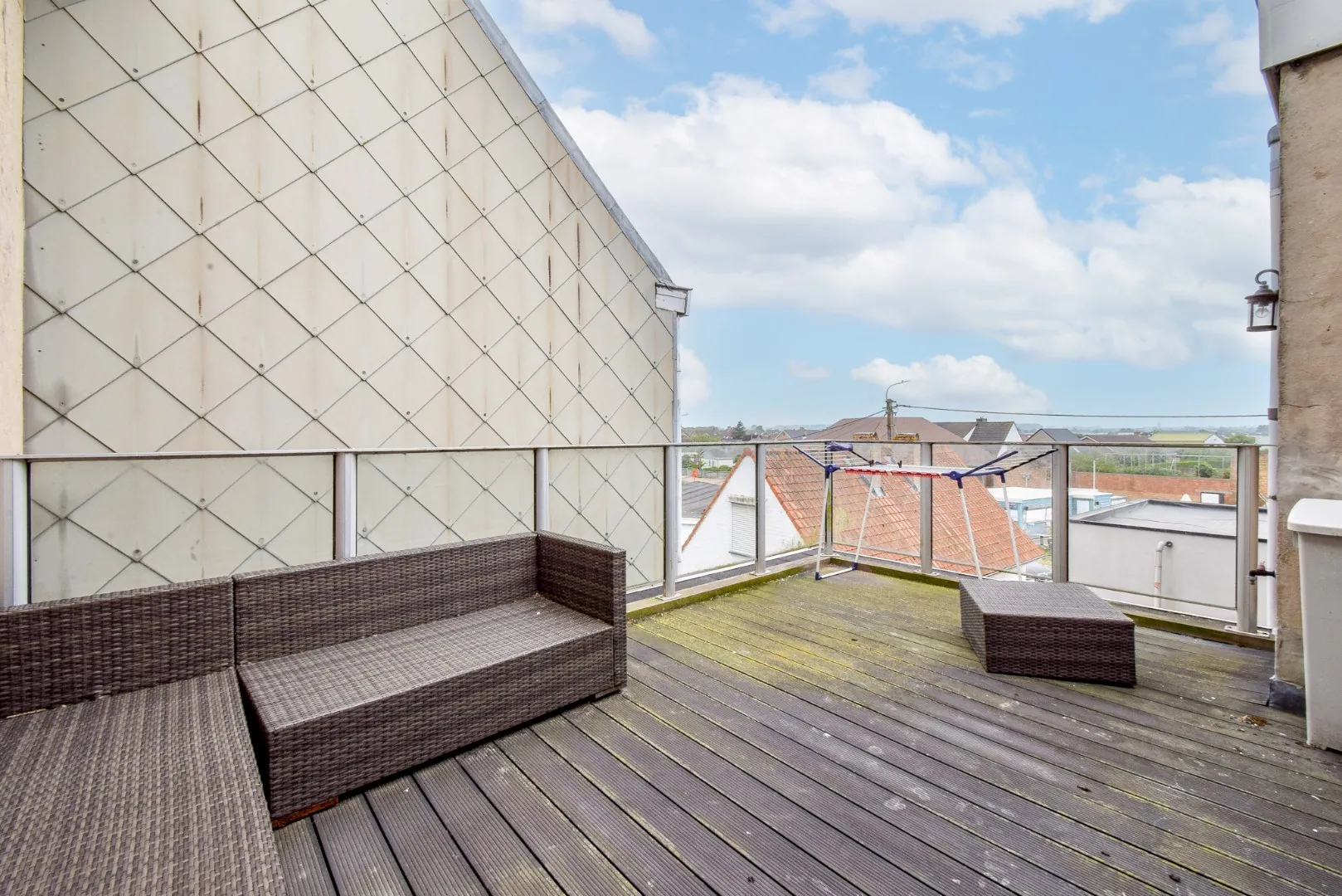 De woonst strekt zich uit over de eerste en tweede verdieping. Op de eerste verdieping vinden we een gezellige leefruimte met open keuken, een zeer ruime badkamer met bad, douche, toilet en dubbele lavabo, een grote slaapkamer, een berging, apart toilet en een terras van 18,25 m².