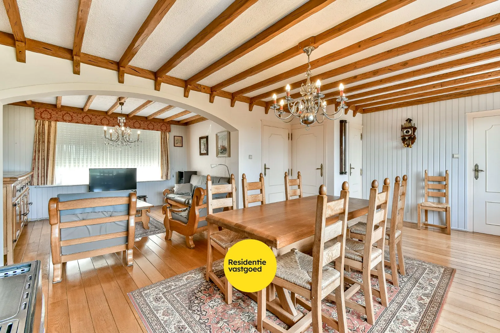 Bij het betreden van de woning komt u in de inkomhal met apart gastentoilet. Van hieruit bereikt u de lichtrijke leefruimte die bestaat uit een gezellige zithoek en een eetplaats. Aansluitend bevindt zich de keuken. Verder is er op het gelijkvloers een praktische garage en een tuinhuis, wat zorgt voor extra bergruimte en gebruiksgemak.