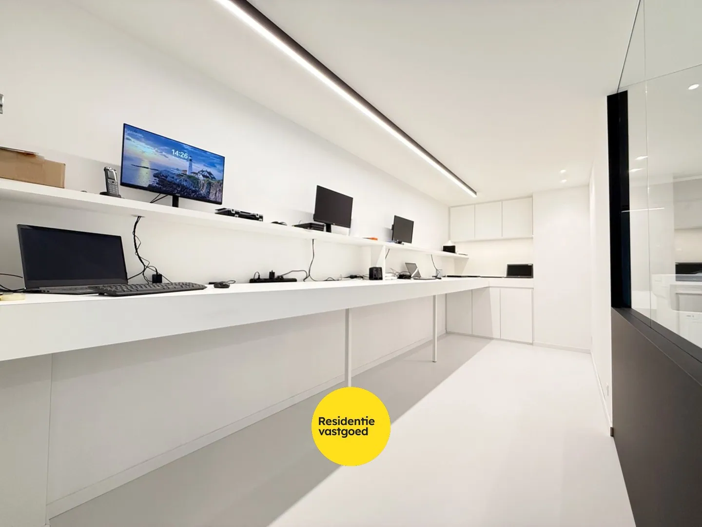 De lichtrijke handelsruimte van maar liefst 90 m² vormt het kloppend hart van het pand en is afgewerkt met een duurzame epoxyvloer, vloerverwarming en een akoestisch spanplafond. Moderne technieken, een geavanceerd alarmsysteem (OMNICRON) en camerabeveiliging zorgen voor een veilige en efficiënte werkomgeving. Het aanwezige werkblad op stahoogte en de slimme indeling maken deze ruimte bijzonder functioneel.