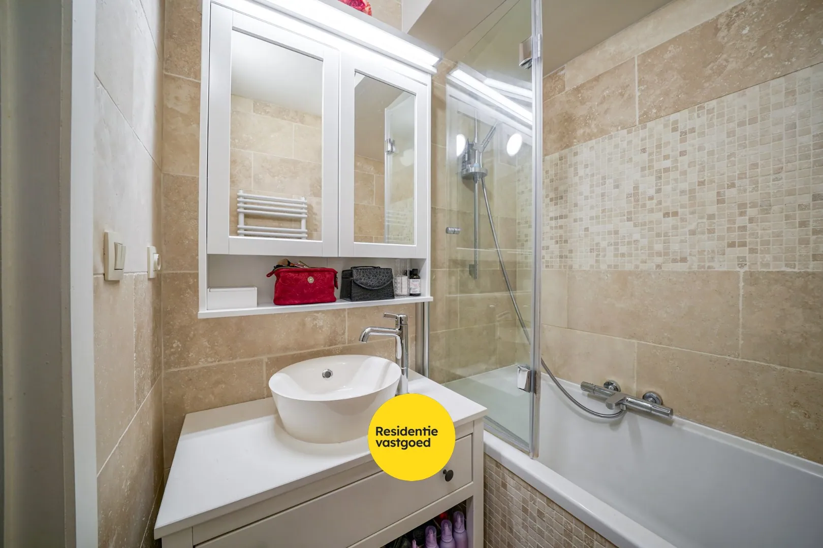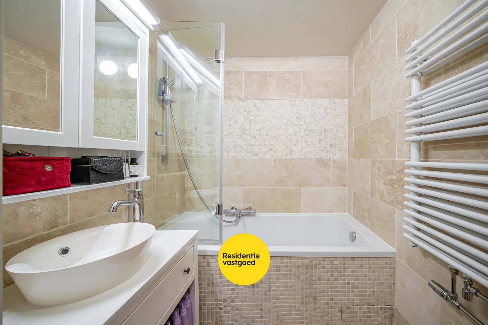 Verder beschikt het appartement over twee volwaardige slaapkamers, een badkamer met ligbad en douchevoorziening, een apart toilet en een handige vestiairezone aan de inkom. Extra bergruimte is voorzien in de privatieve kelder.