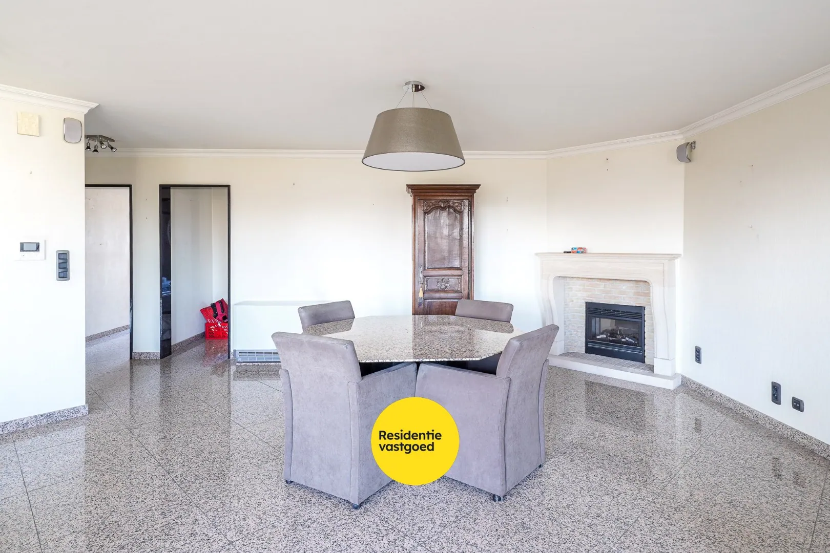 Bij het betreden van het appartement kom je in de inkomhal met een apart gastentoilet en lavabo. De ruime en lichtrijke leefruimte is afgewerkt met een tegelvloer en beschikt over videofonie en een schouw met elektrische kachel. Aansluitend bevindt zich de open keuken, die praktisch is ingericht met een granieten werkblad, elektrische kookplaat, dubbele spoelbak, vaatwasmachine, combi-oven en frigo.