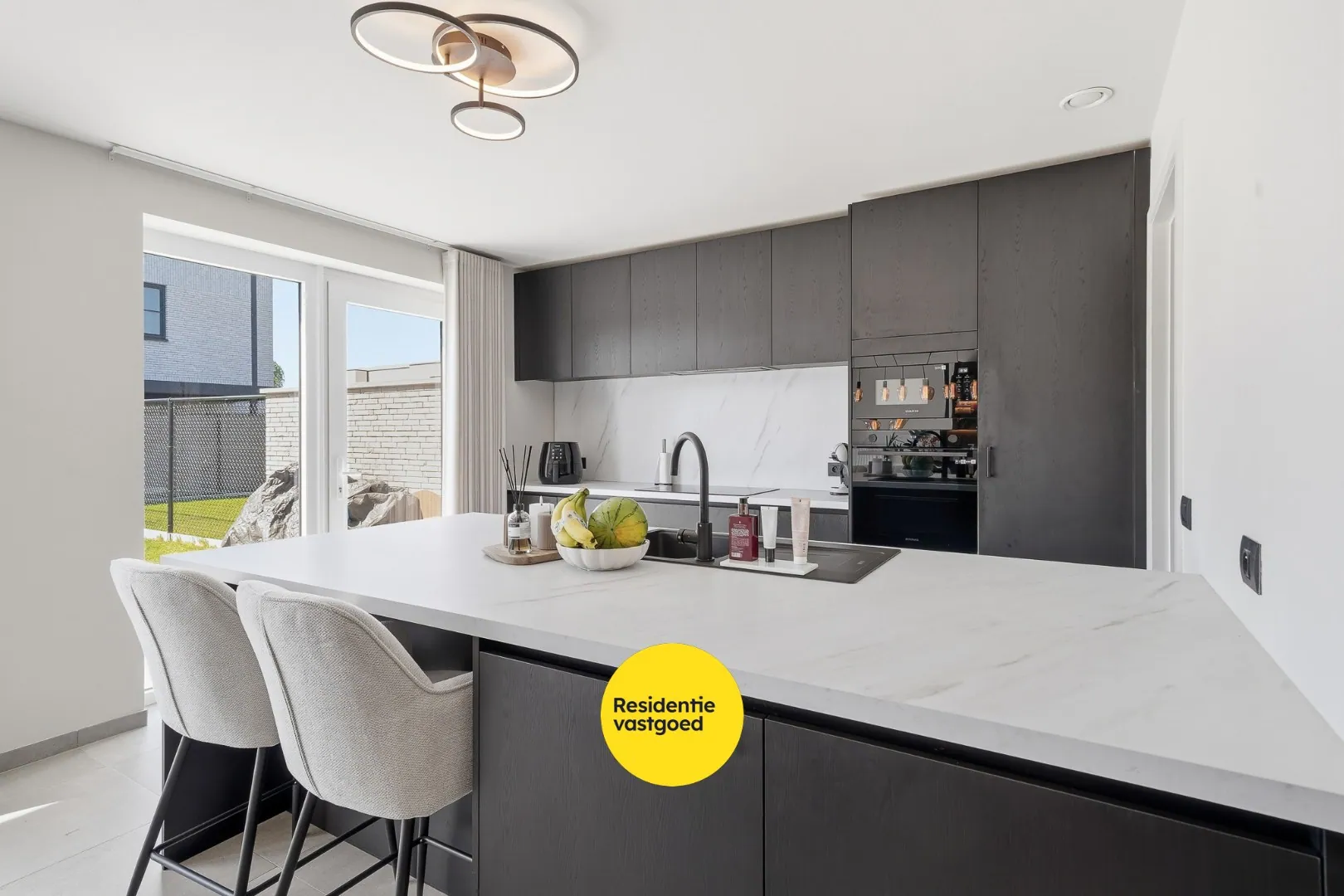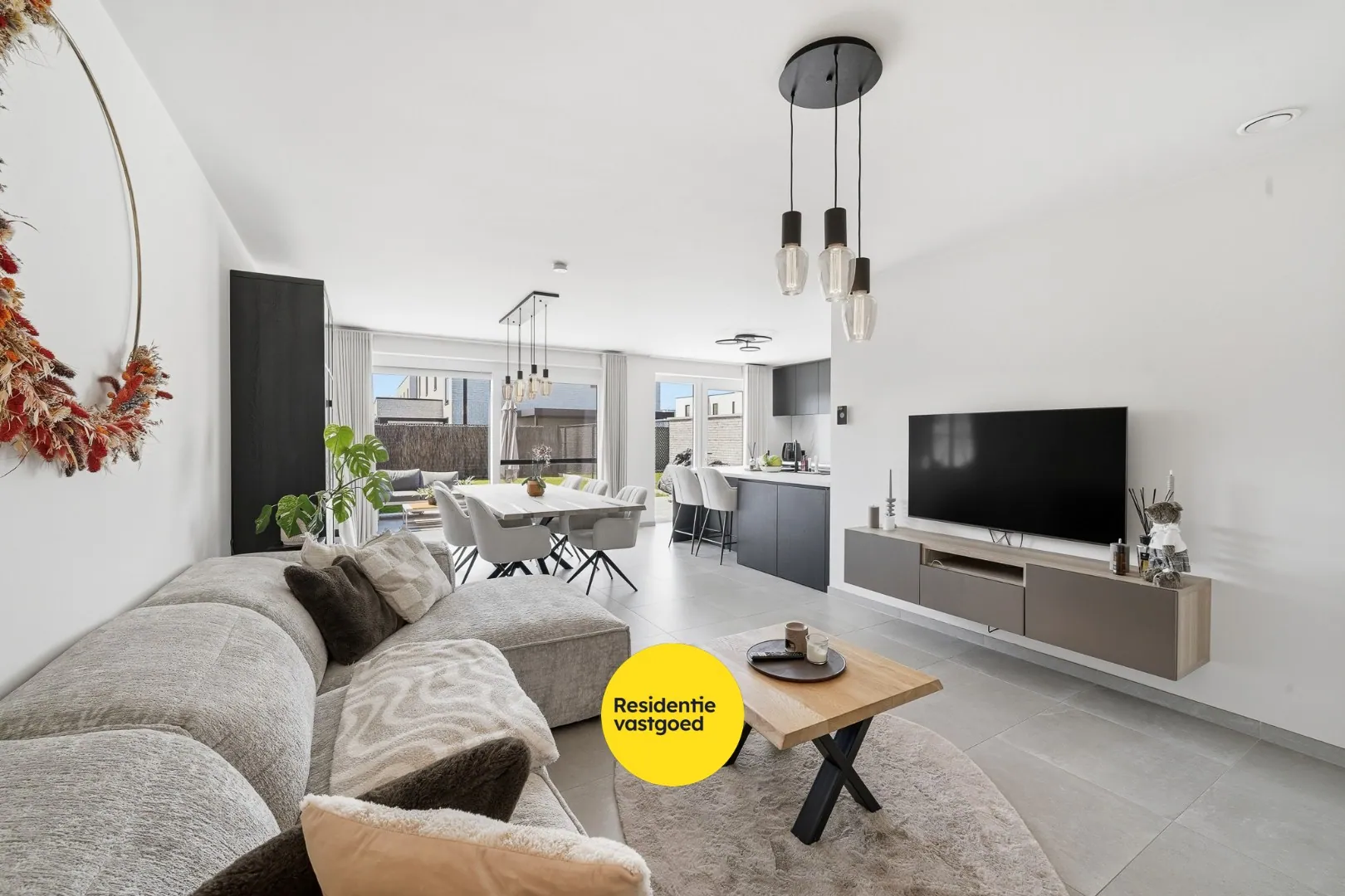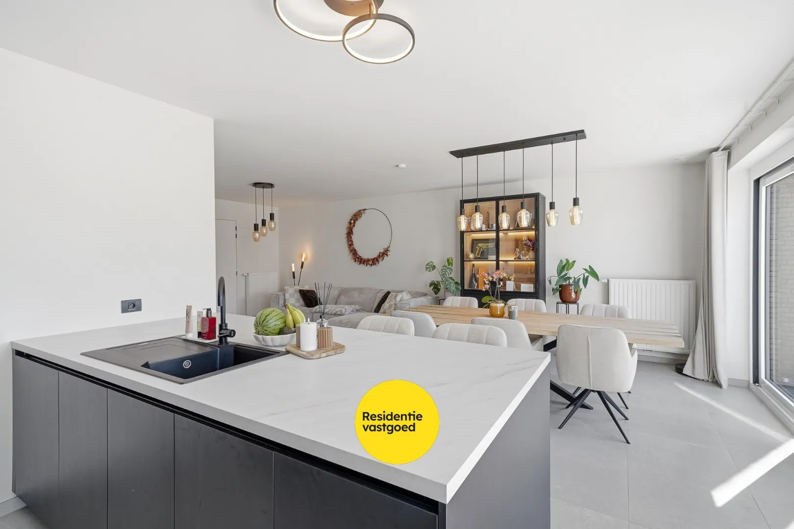 Bij het betreden van de woning komt u in de inkomhal met vestiairekast en gastentoilet. De lichtrijke leefruimte met grote raampartijen en schuifraam geeft uit op het terras en zorgt voor een aangename woonbeleving. Aansluitend bevindt zich de open, volledig uitgeruste keuken met kookeiland – aansluitend is er de inpandige garage met alle technieken alsook voldoende ruimte voor wasmachine en eventuele droogkast.