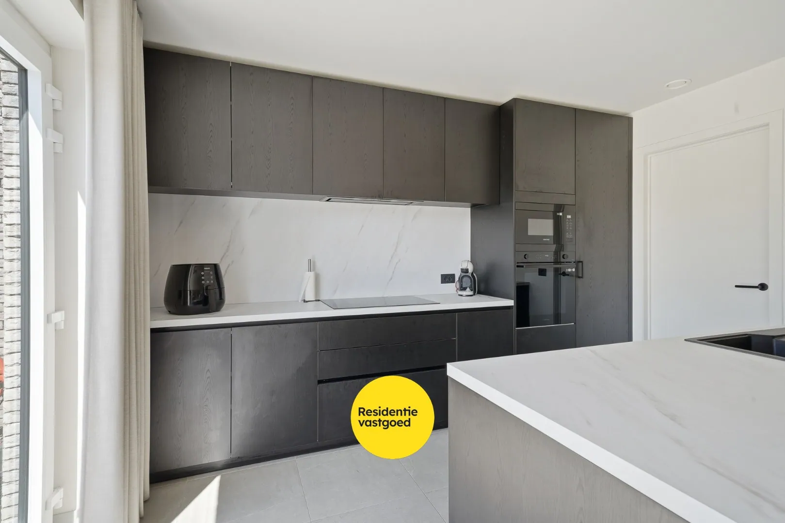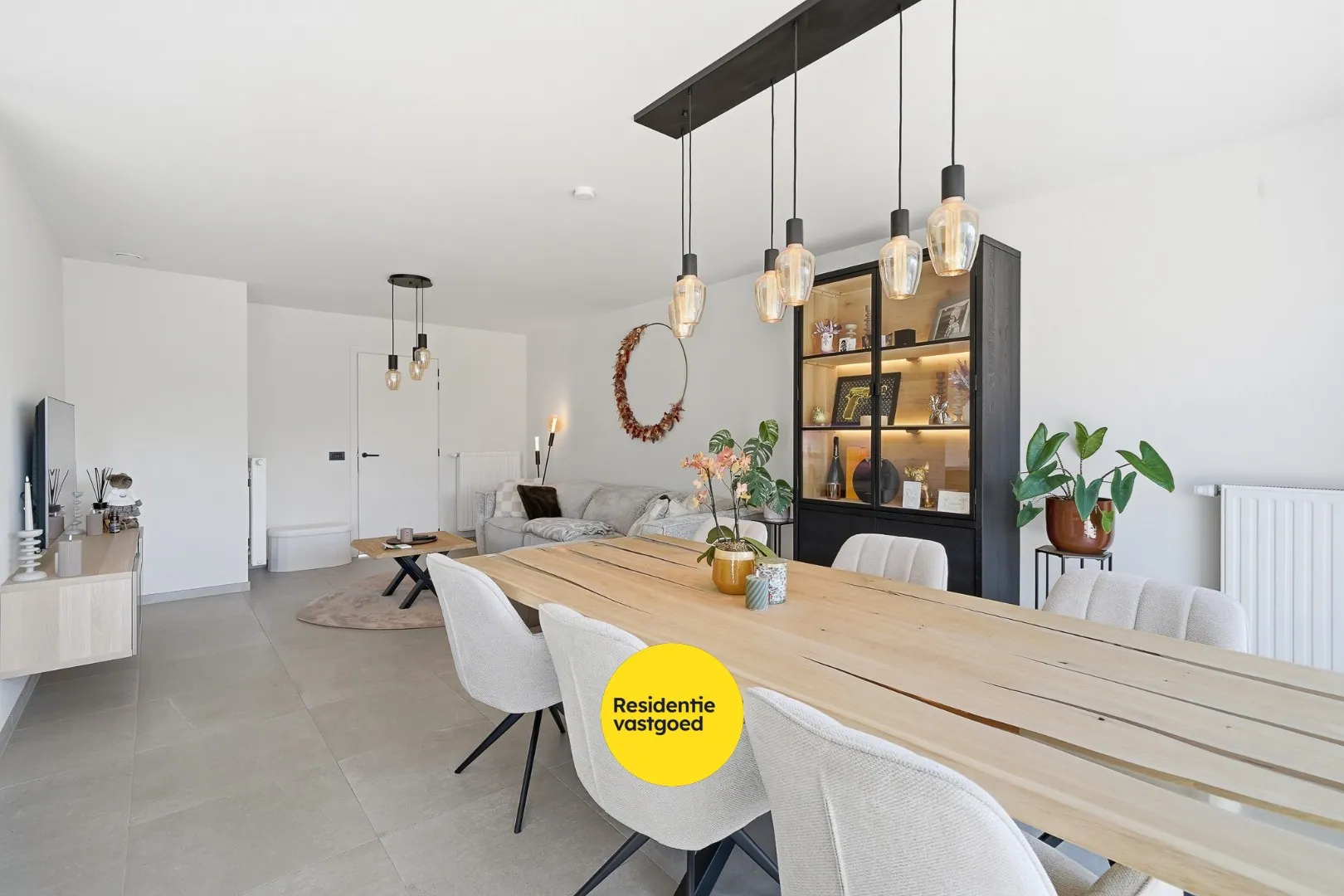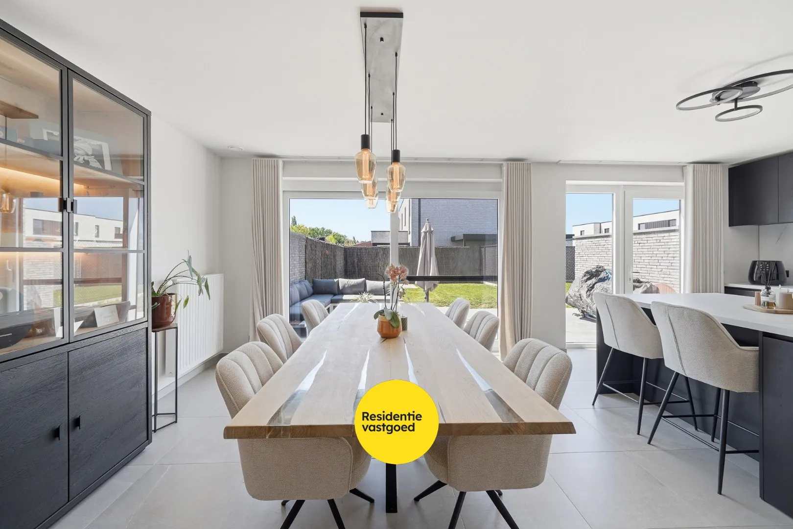 Bij het betreden van de woning komt u in de inkomhal met vestiairekast en gastentoilet. De lichtrijke leefruimte met grote raampartijen en schuifraam geeft uit op het terras en zorgt voor een aangename woonbeleving. Aansluitend bevindt zich de open, volledig uitgeruste keuken met kookeiland – aansluitend is er de inpandige garage met alle technieken alsook voldoende ruimte voor wasmachine en eventuele droogkast.