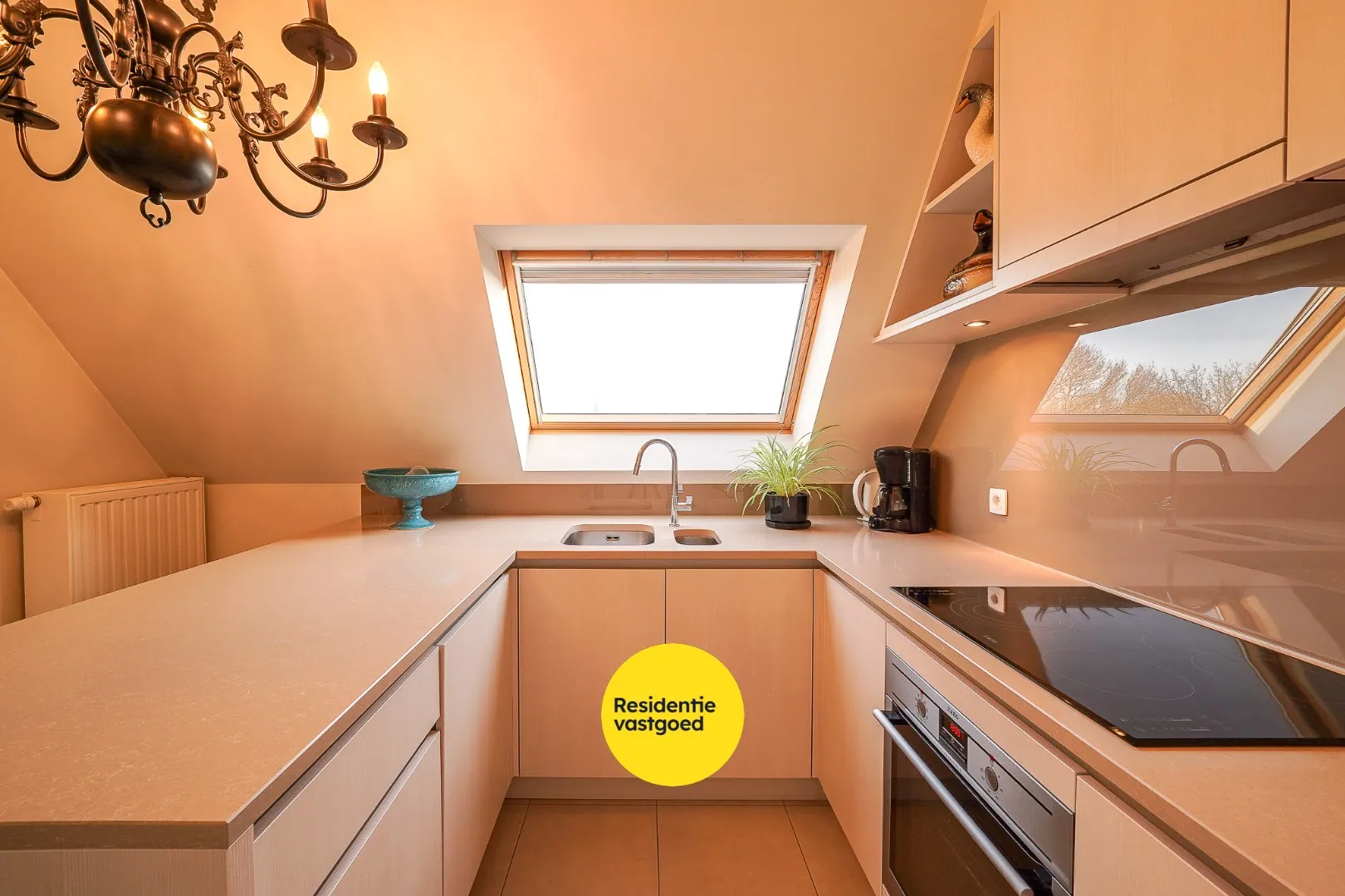 Bij het binnenkomen word je verwelkomd in een nette inkomhal met gastentoilet, die via de trap toegang geeft tot de verschillende leefniveaus. De lichtrijke leefruimte met warme parketvloer vormt het hart van het appartement en biedt een aangename verbinding met het terras aan de vaartzijde, waar het heerlijk vertoeven is in alle rust. Aan de achterzijde bevindt zich een tweede, zonnig terras, wat zorgt voor buitenruimte op elk moment van de dag. De volledig uitgeruste keuken sluit perfect aan bij de leefruimte en beschikt over kwalitatieve toestellen en een praktisch werkblad, ideaal voor wie graag kookt. Aansluitend is er een ruime berging met plaats voor wasmachine, diepvries en technische installaties.