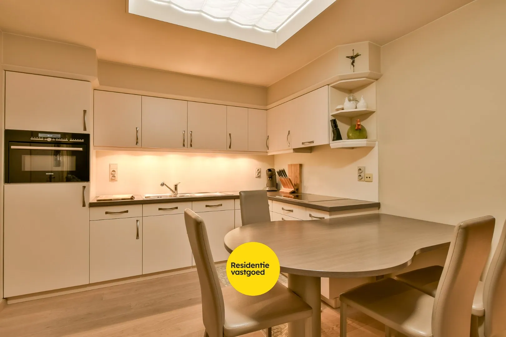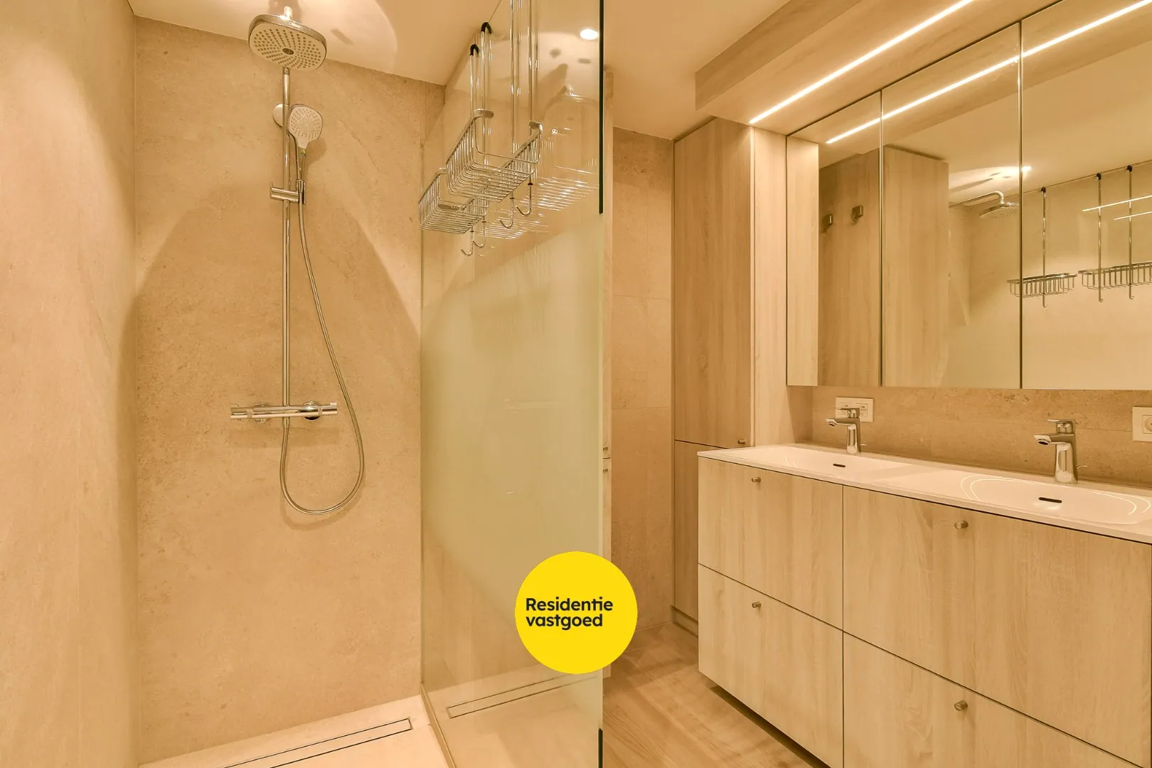 Achteraan de woning bevindt zich de volledig uitgeruste keuken met kwalitatieve toestellen en voldoende werkruimte. Verder beschikt de woning over een moderne badkamer met inloopdouche en maatkasten, een apart toilet en verschillende praktische bergruimtes.