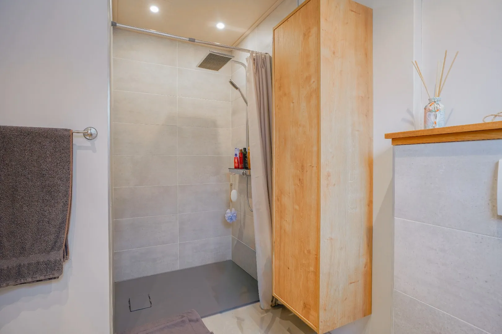 Een troef van de woning is de ruime veranda van ca. 39 m², die een mooie overgang vormt tussen binnen en buiten. Op het gelijkvloers bevindt zich eveneens een badkamer met inloopdouche, hangtoilet en lavabo.