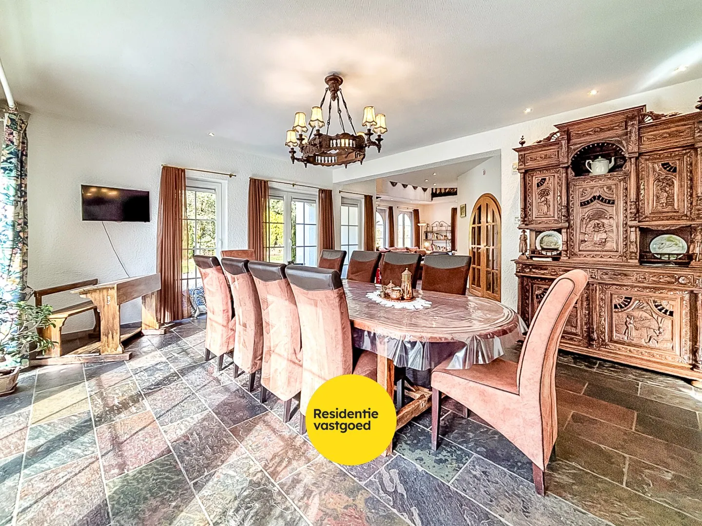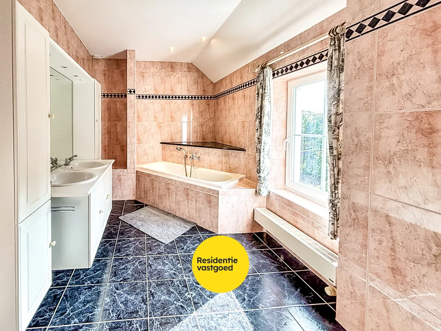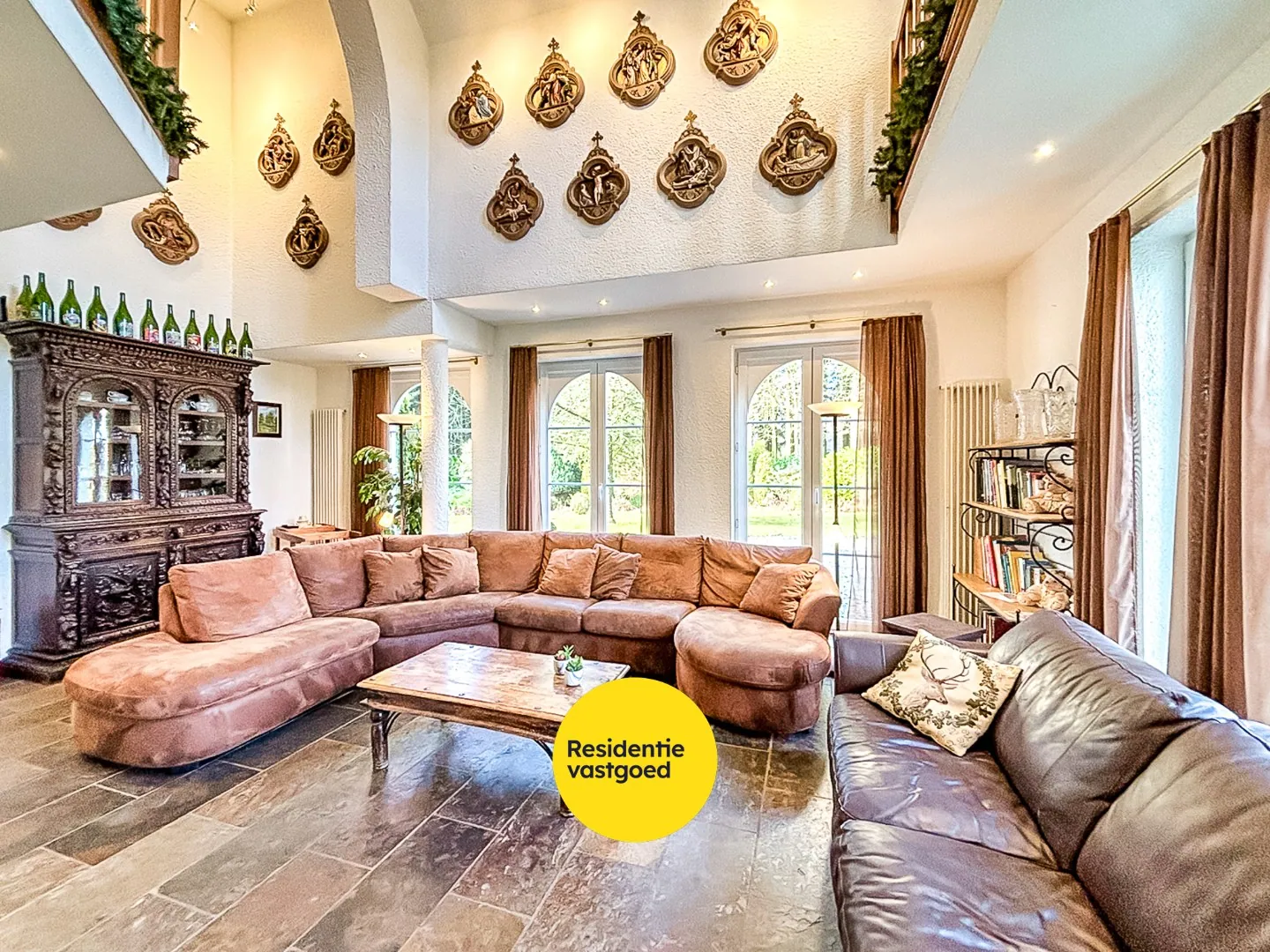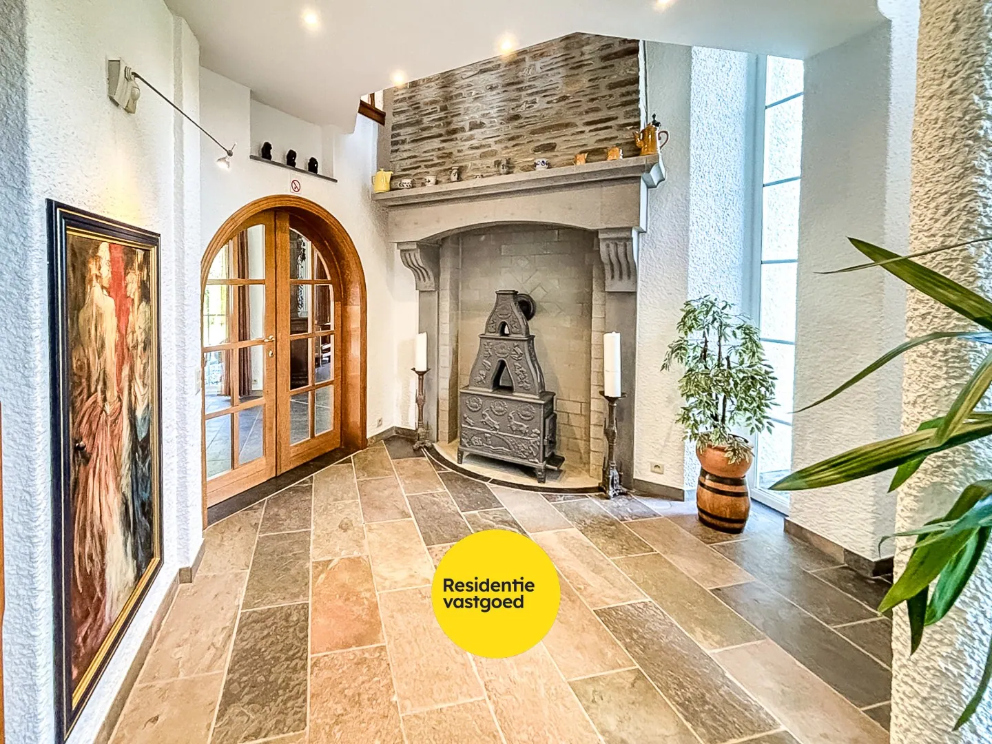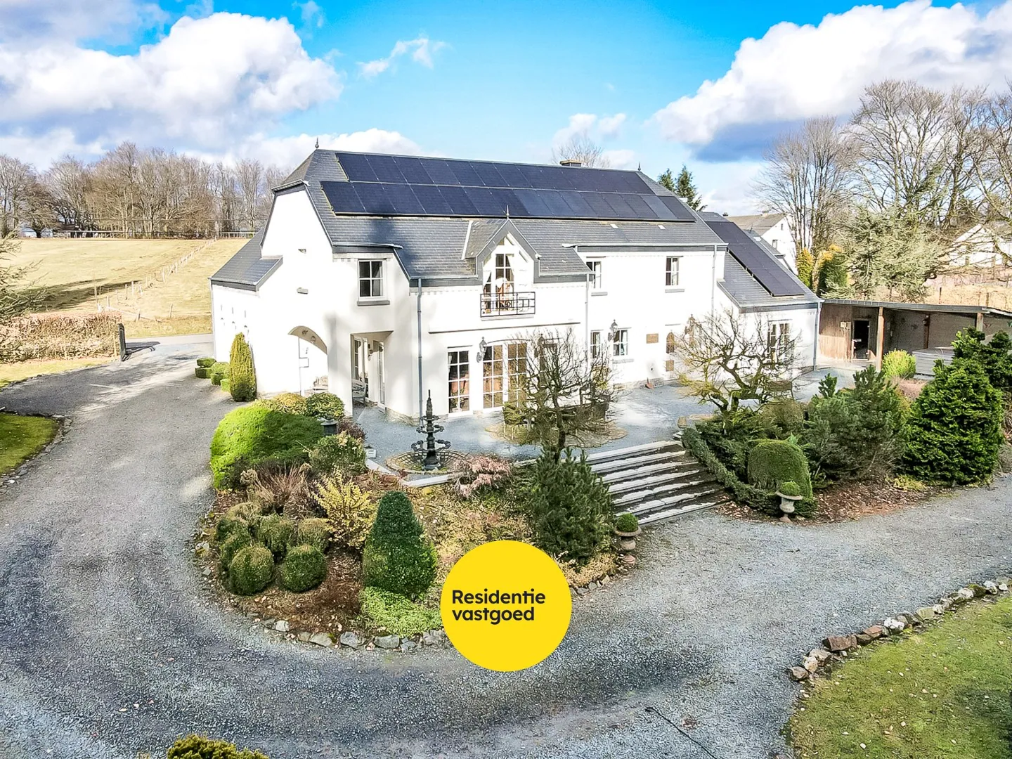 We betreden de woning via een karaktervolle toren waar de warme inkomhal ons ontvangt. De lichtrijke woonkamer geniet van hoge plafonds, een gezellige houtkachel en prachtig zicht op de groene aangelegde omgeving. Verder is er een uitgerust keuken, een praktische bijkeuken, een ruime eetplaats, één slaapkamer, één gastentoilet, technische ruimte, bergruimte en één badkamer met bad, douche en twee lavabo's. Op de eerste verdieping zijn er vier slaapkamers, een mezzanine met plaats voor een kantoorruimte of ontspanningsruimte en één badkamer met ligbad, dubbele lavabo en een toilet. Buiten vinden we een ruim bijgebouw dat dienstdoet als garage en bergruimte. Alsook een praktische buitenkeuken.