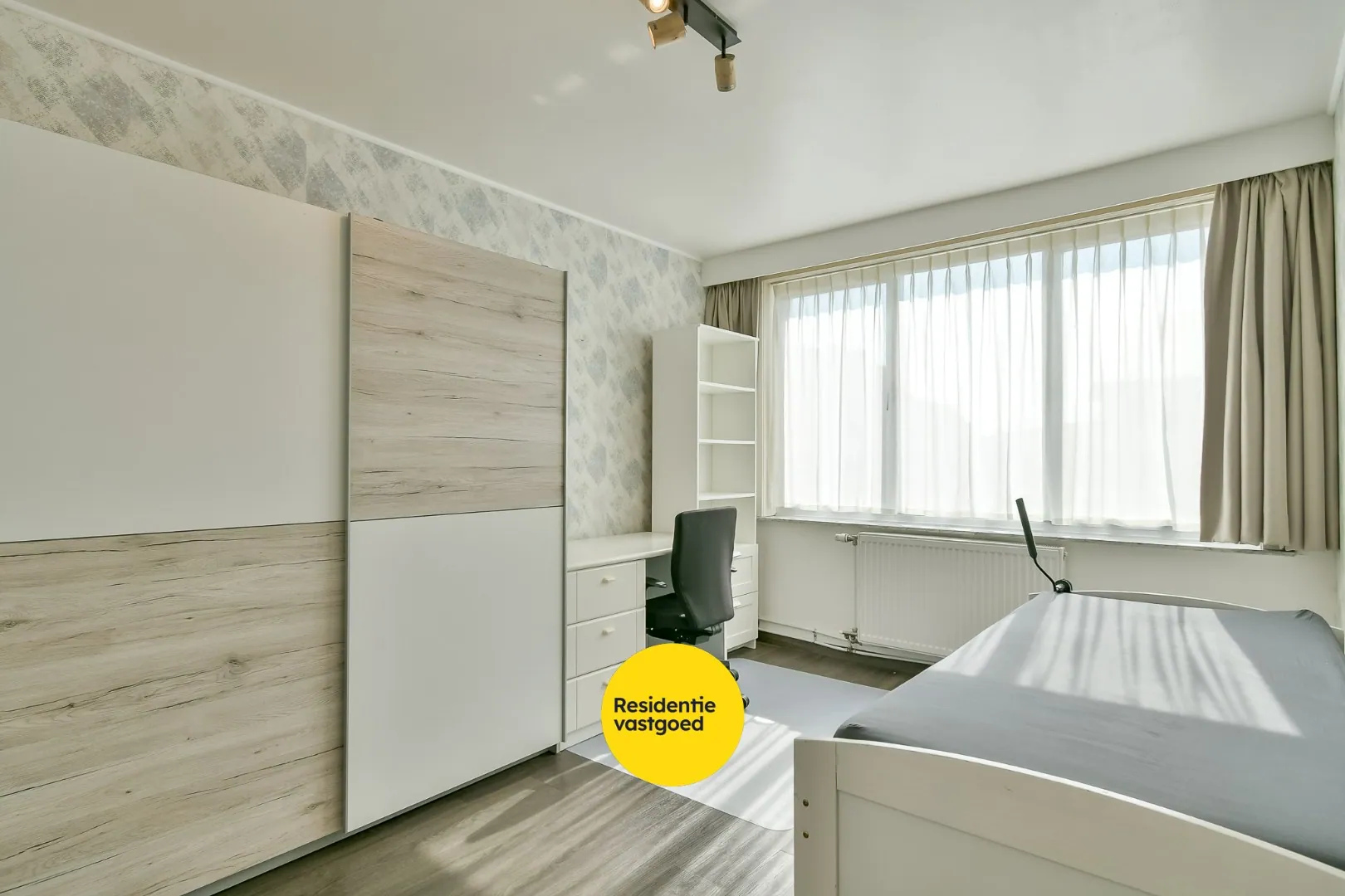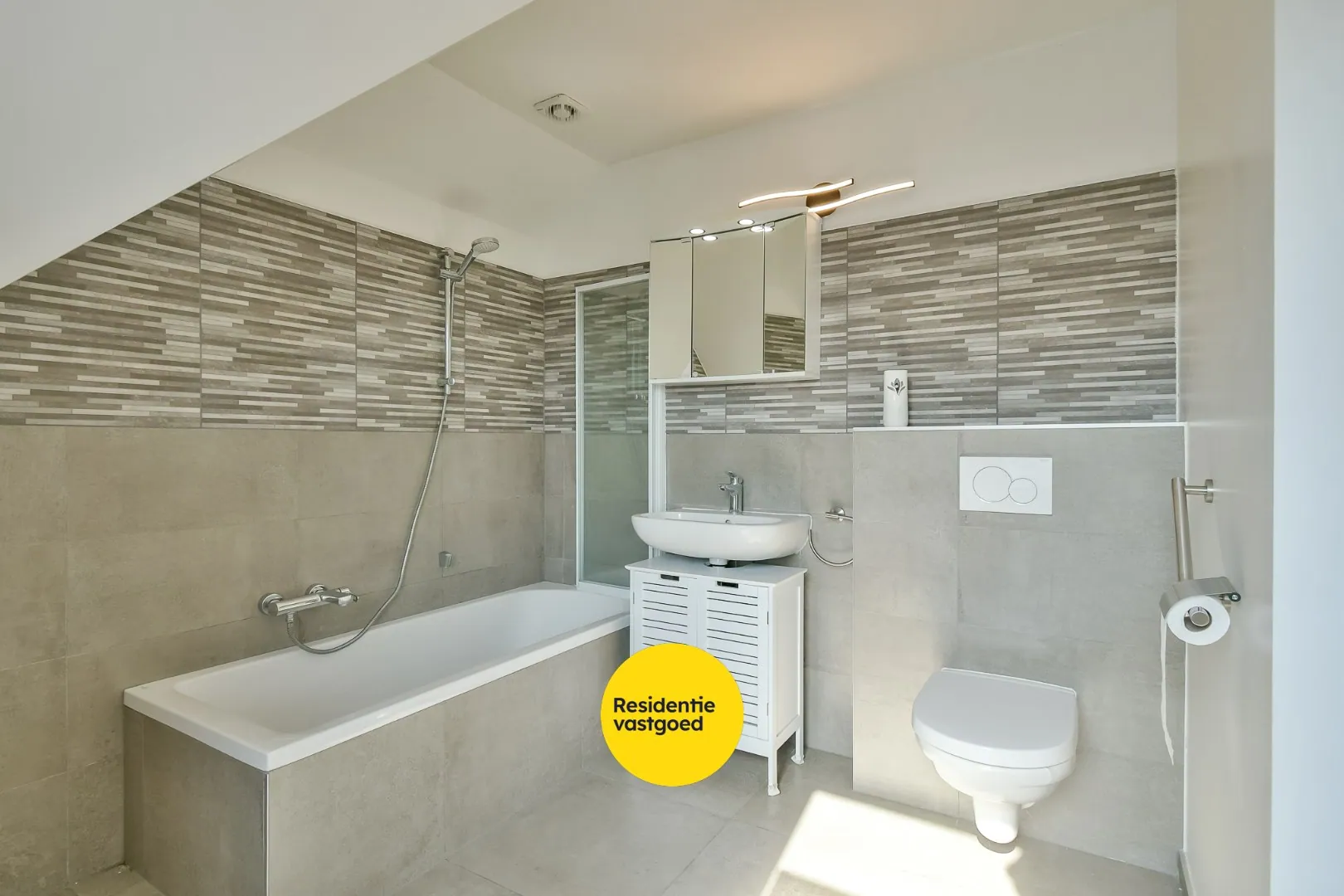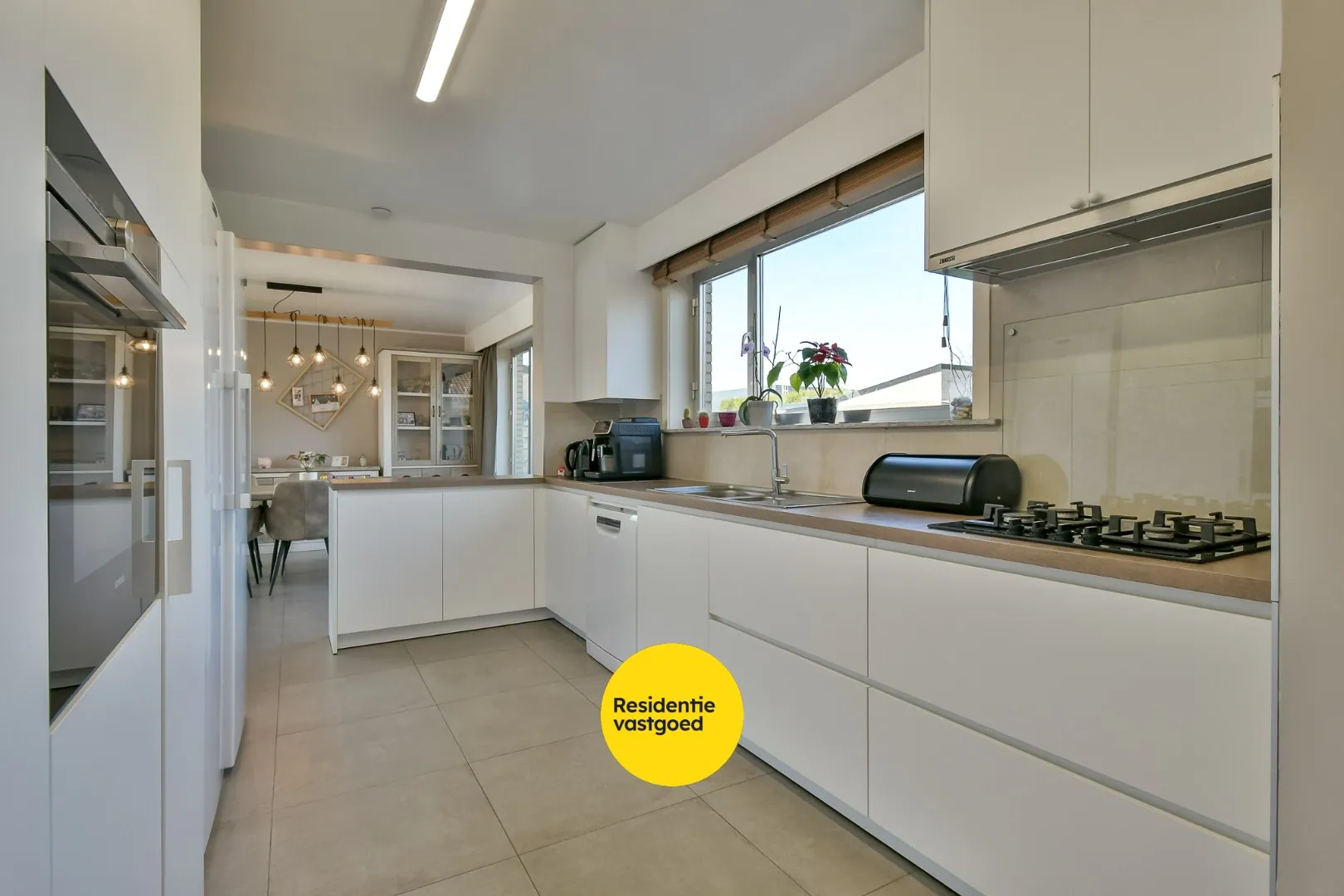 U betreedt de woning via een ruime inkomhal met gastentoilet en vestiaire. De lichtrijke leefruimte met grote raampartijen sluit naadloos aan op de eetplaats met zicht op de groene tuin. De moderne open keuken is voorzien van kwalitatieve toestellen. Op het gelijkvloers bevindt zich bovendien een extra slaapkamer, ideaal als bureau, praktijkruimte of thuiskantoor.
