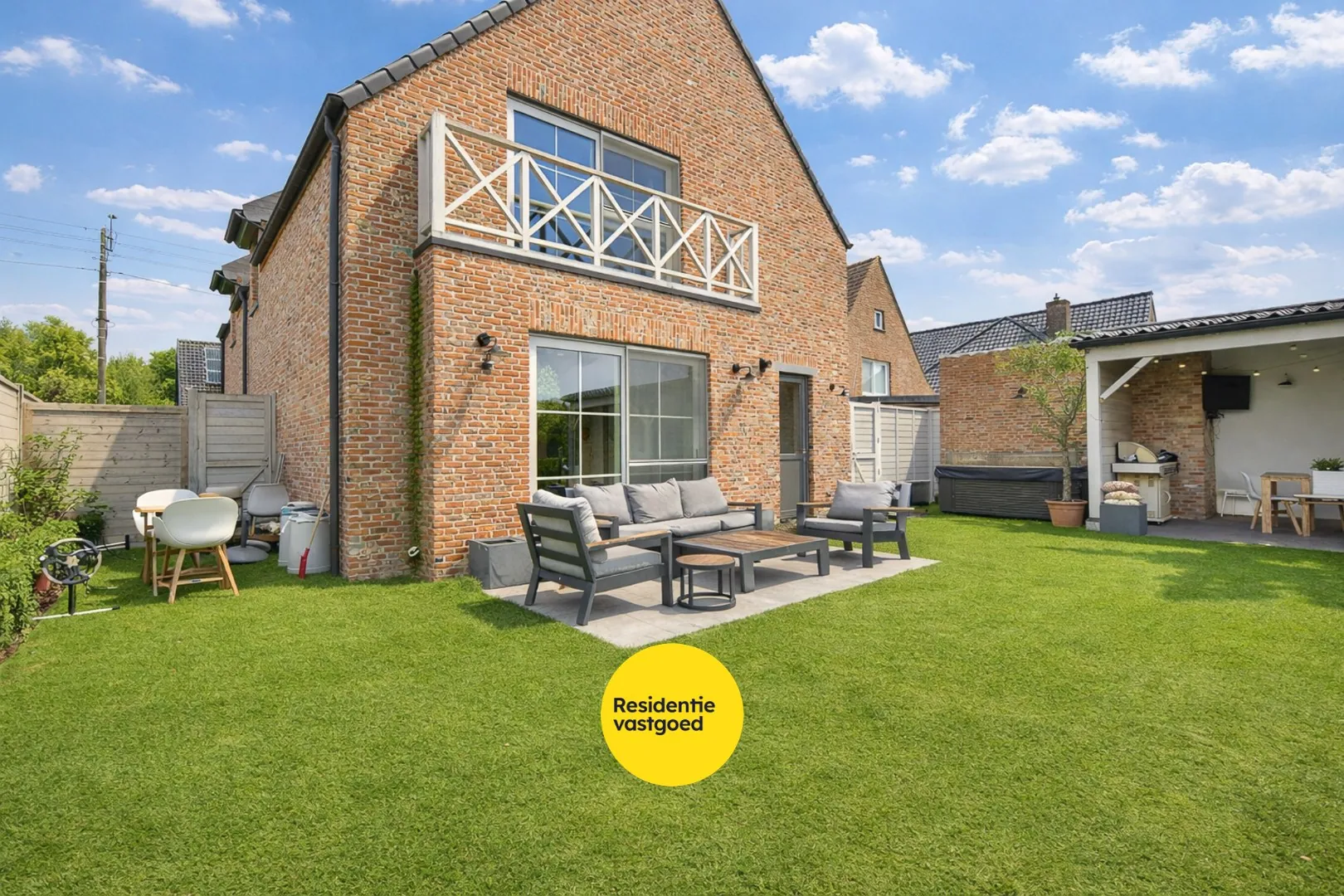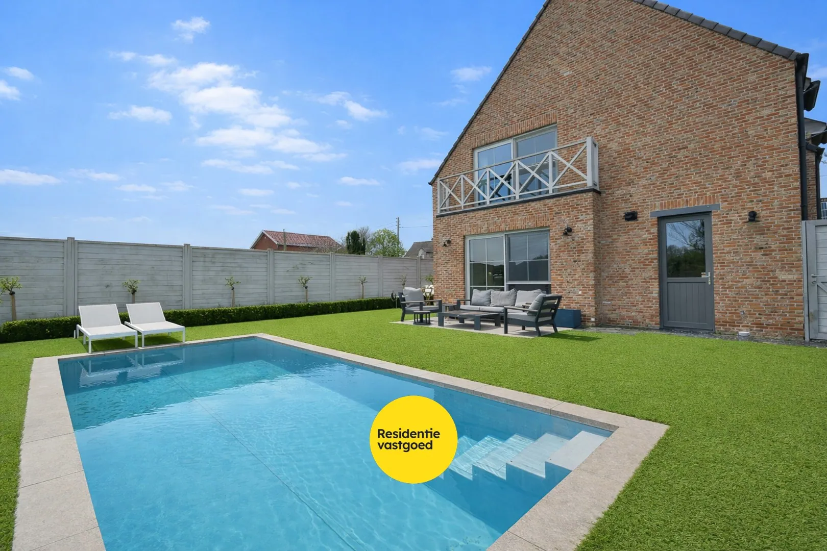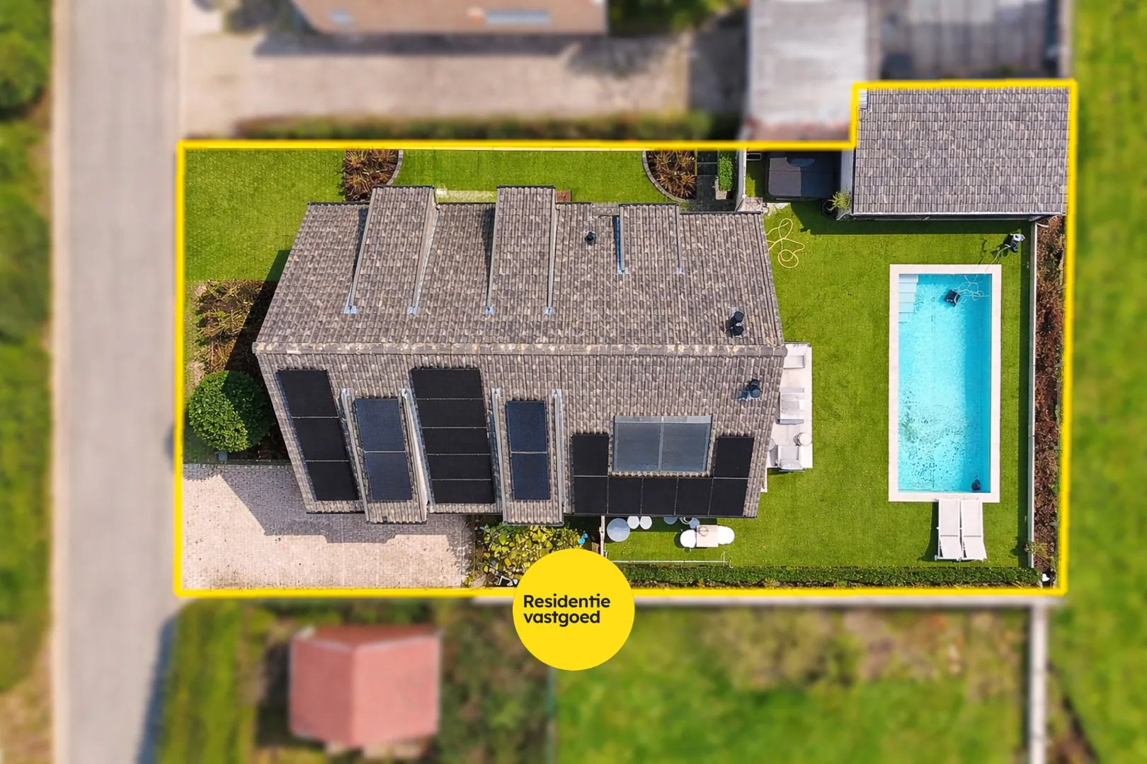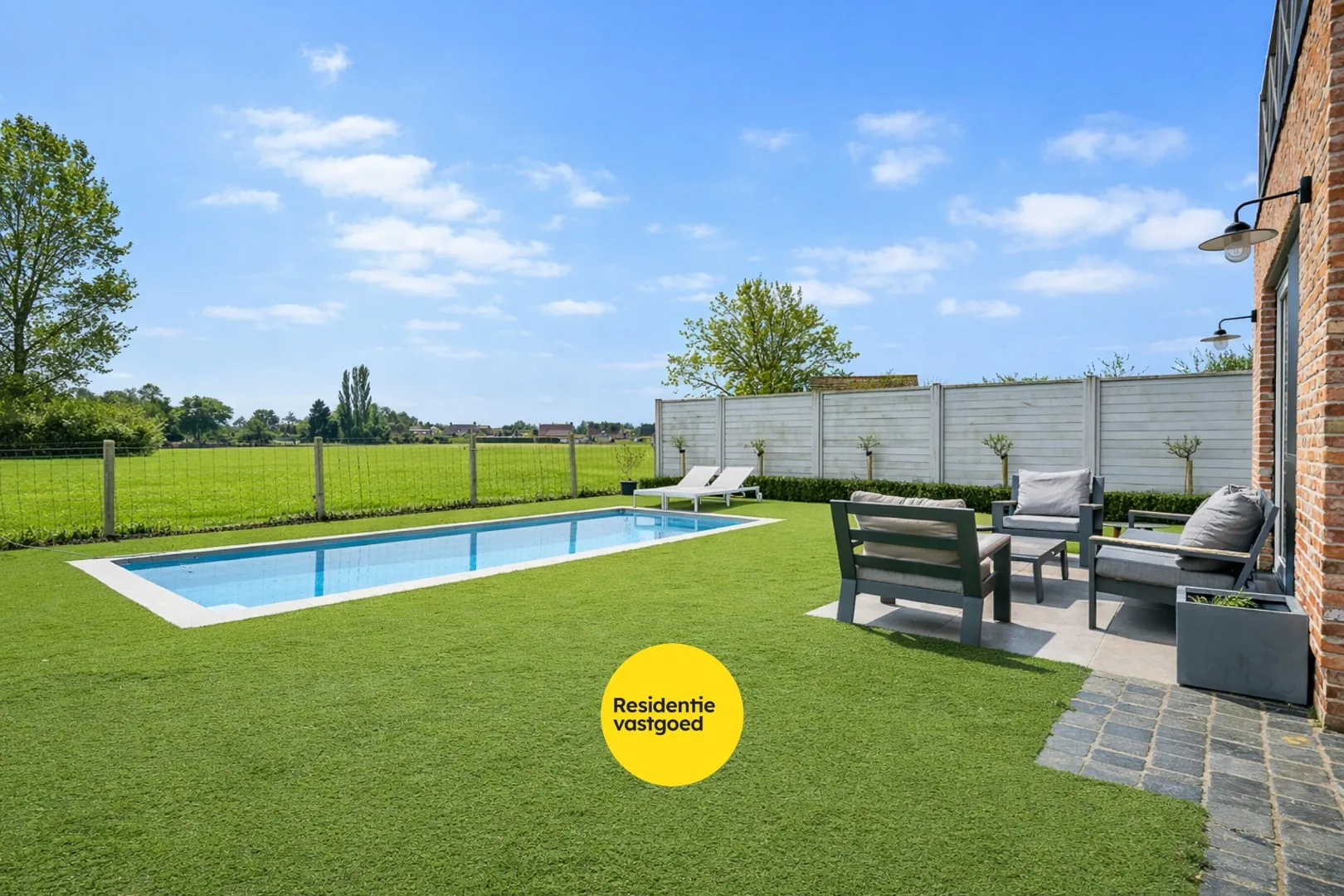 De onderhoudsvriendelijke tuin met kunstgras biedt een landelijk vergezicht en beschikt over een zwembad en poolhouse, ideaal om in de zomer optimaal te genieten.
