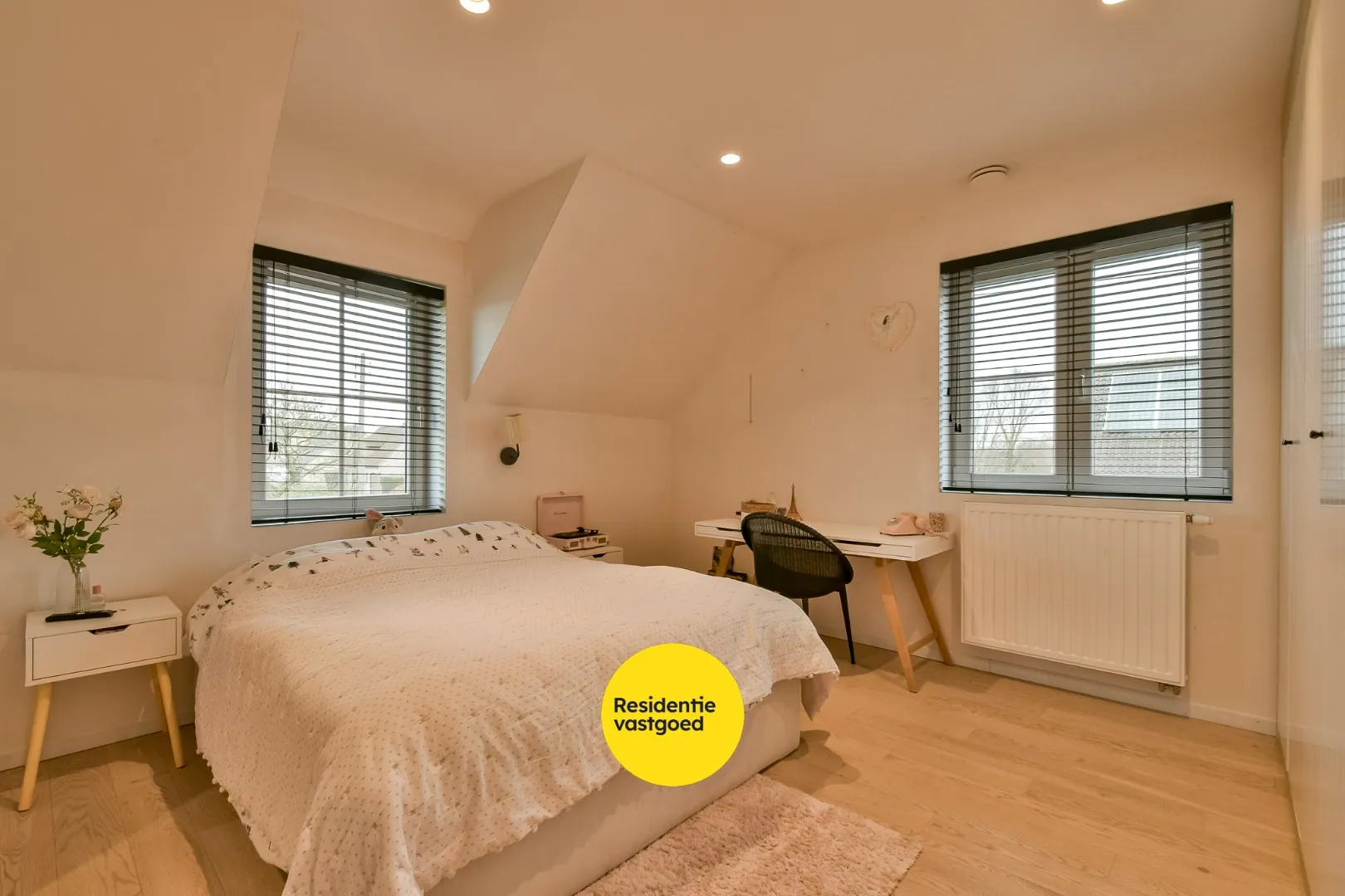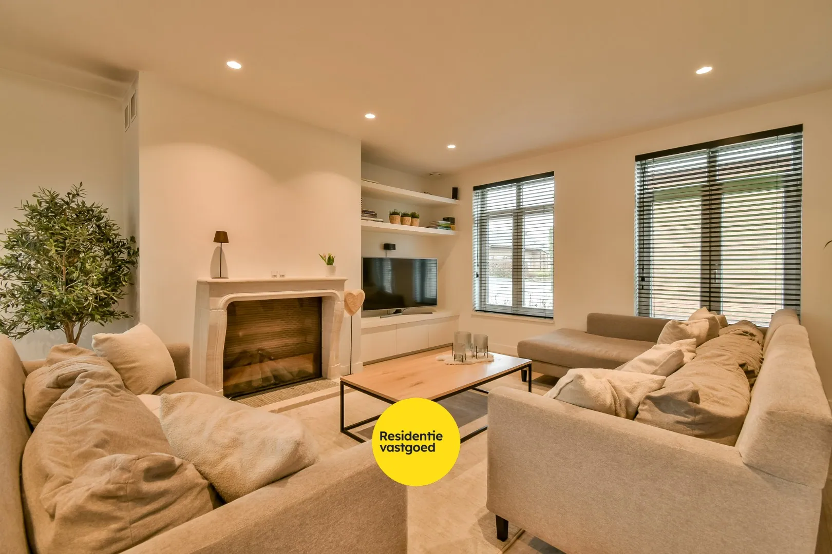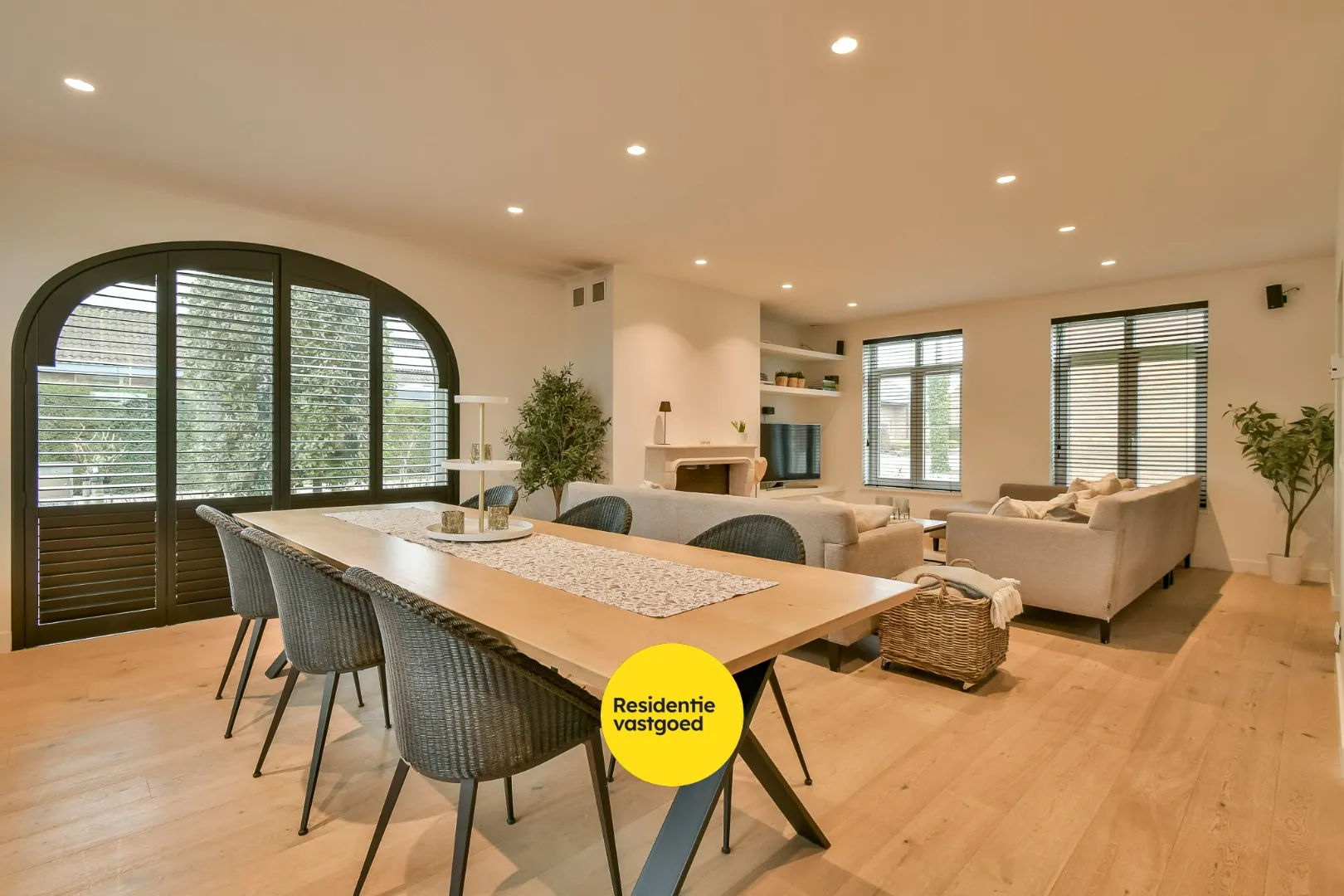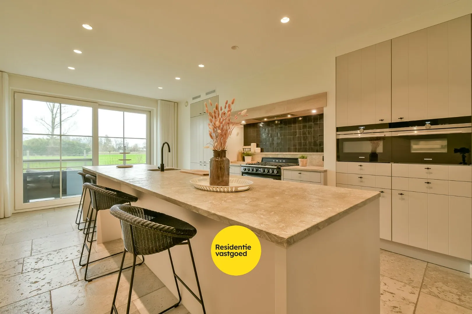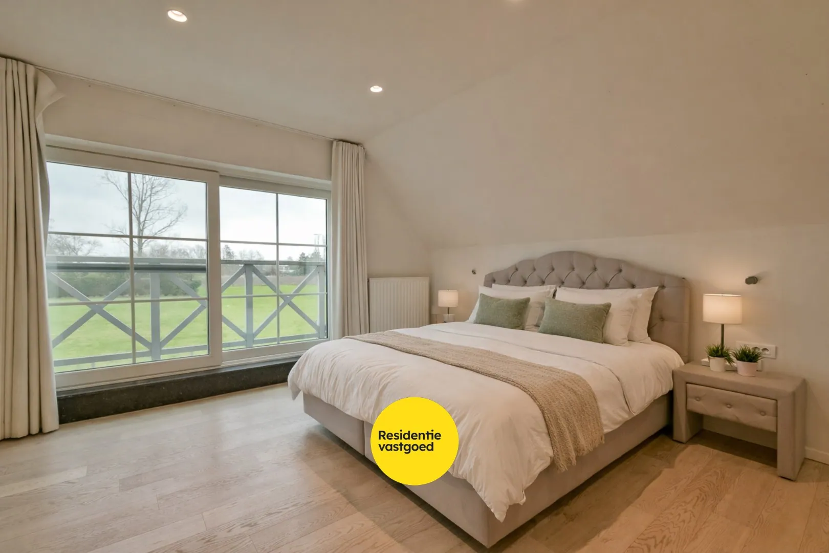 De onderhoudsvriendelijke tuin met kunstgras biedt een landelijk vergezicht en beschikt over een zwembad en poolhouse, ideaal om in de zomer optimaal te genieten.