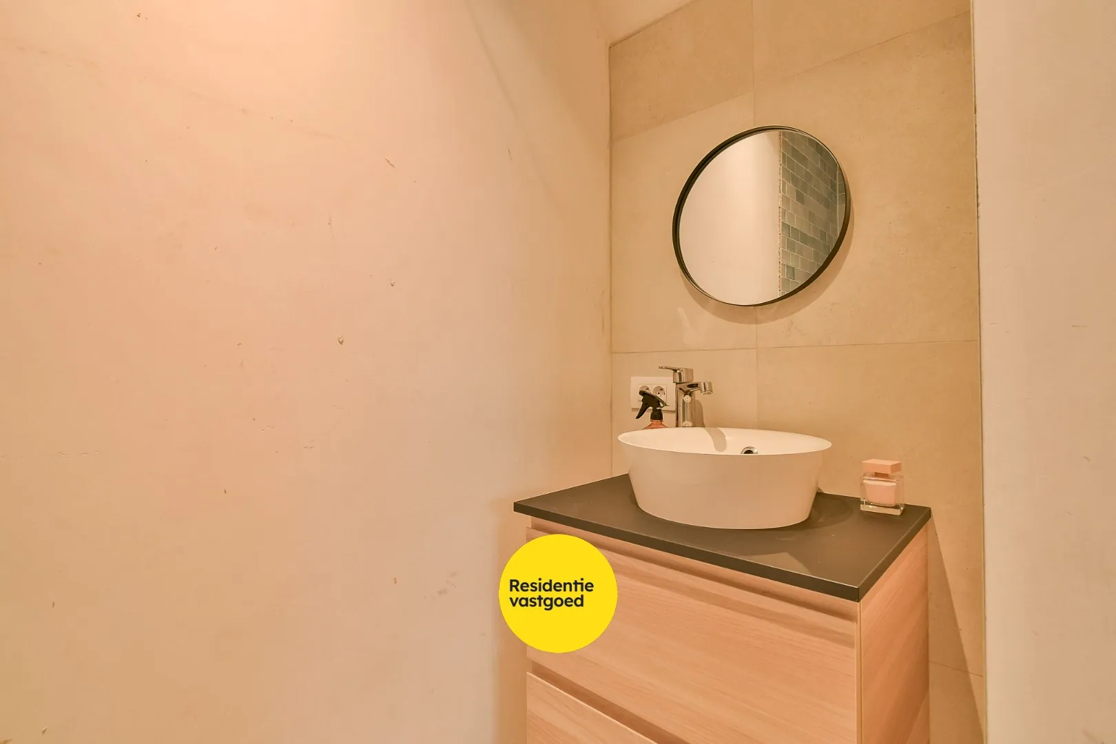 U betreedt de woning via een ruime inkomhal met gastentoilet die overgaat in de lichtrijke woonkamer met parketvloer. Dankzij de grote raampartijen geniet u hier van veel natuurlijk licht, daarnaast zorgt de gashaard voor extra sfeer en gezelligheid. De volledig uitgeruste keuken beschikt over kwalitatieve toestellen en is afgewerkt met een natuurstenen vloer en werkblad. Aansluitend bevindt zich een praktische wasplaats.