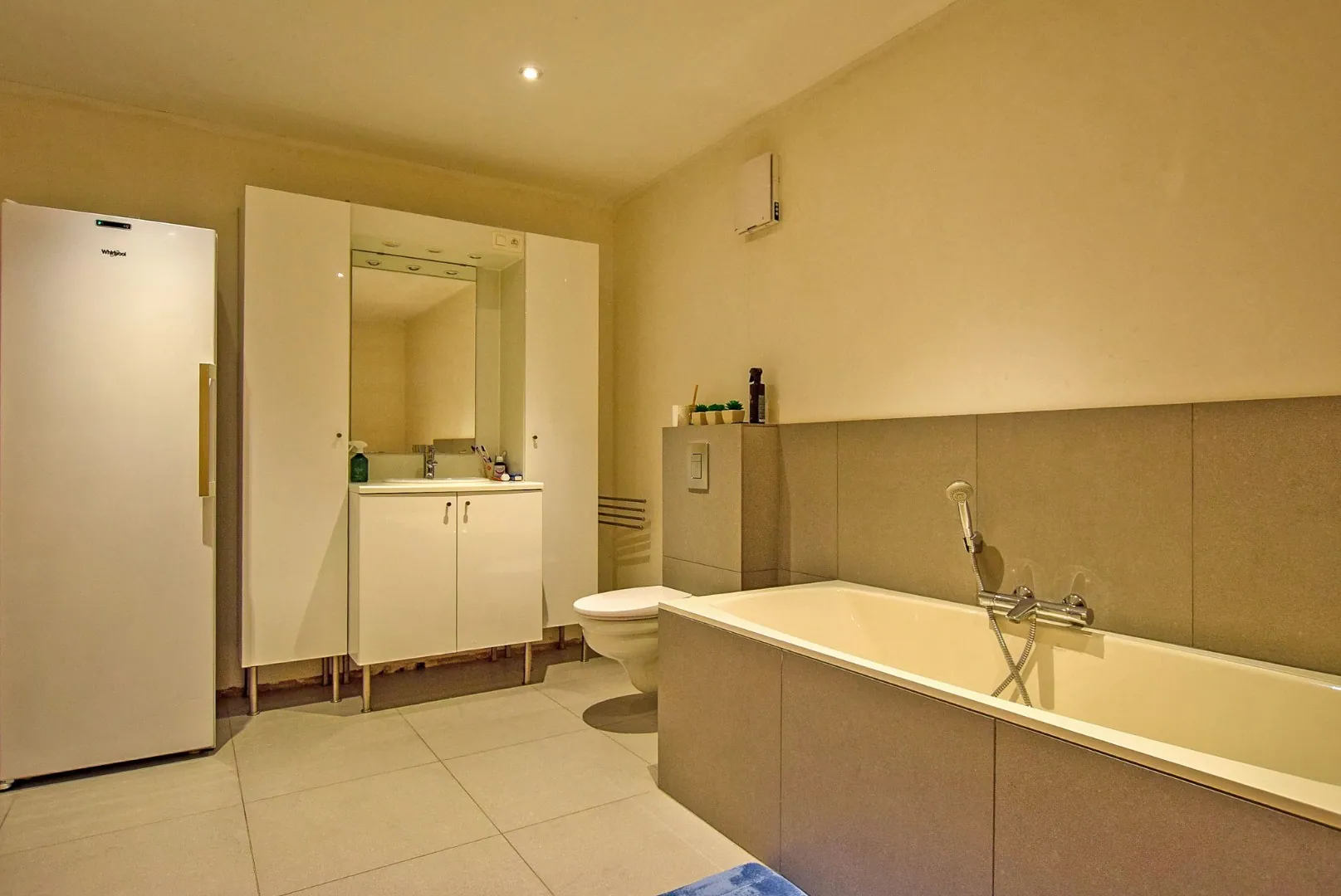 Op de bovenverdieping bevinden zich 2 ruime slaapkamers en een moderne badkamer met ligbad en inloopdouche. Via de nachthal is er toegang tot de zolderruimte, handig als extra berging. De tuin is een rustige plek om te genieten, met voldoende privacy. Achteraan werd een volwaardige extra woonunit gecreëerd, bestaande uit: